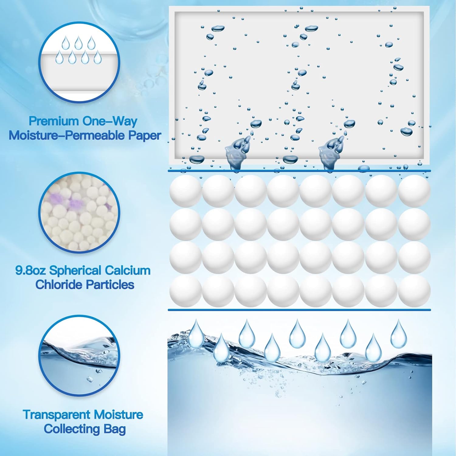 • HOW THEY WORK: Calcium chloride particles combine with moisture in the air and once they become completely solidified the particles will dissolve and the solution will flow into water reservoir. Please be patient for the process, it may take some time.