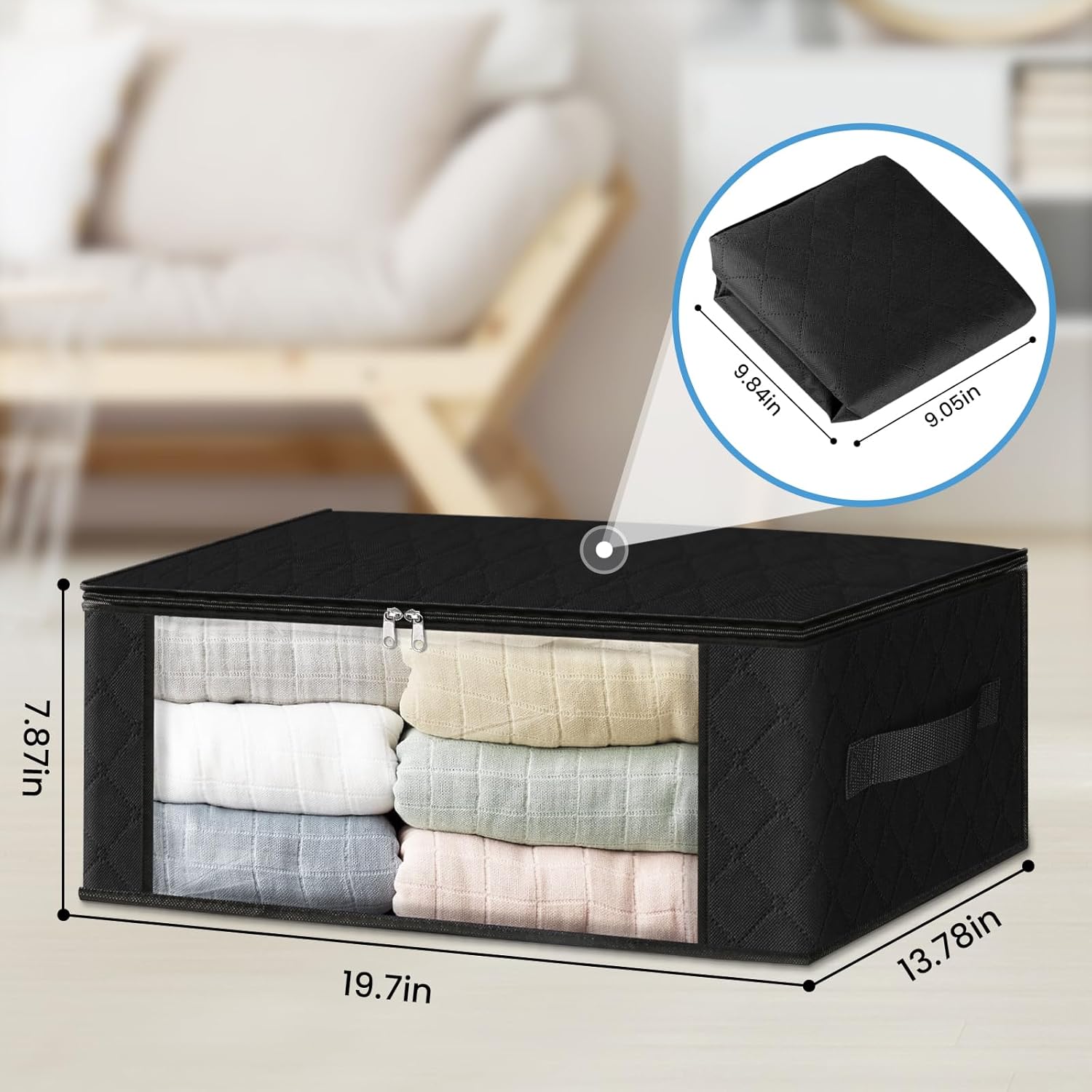 HomeHacks Storage 3-Pack Clothes Organizer Storage Bags Foldable Storage Box with Large Clear Window Sturdy Handles for Closet, Dorm, Pillows, Bedding, Clothes, Blankets, 35L, Black