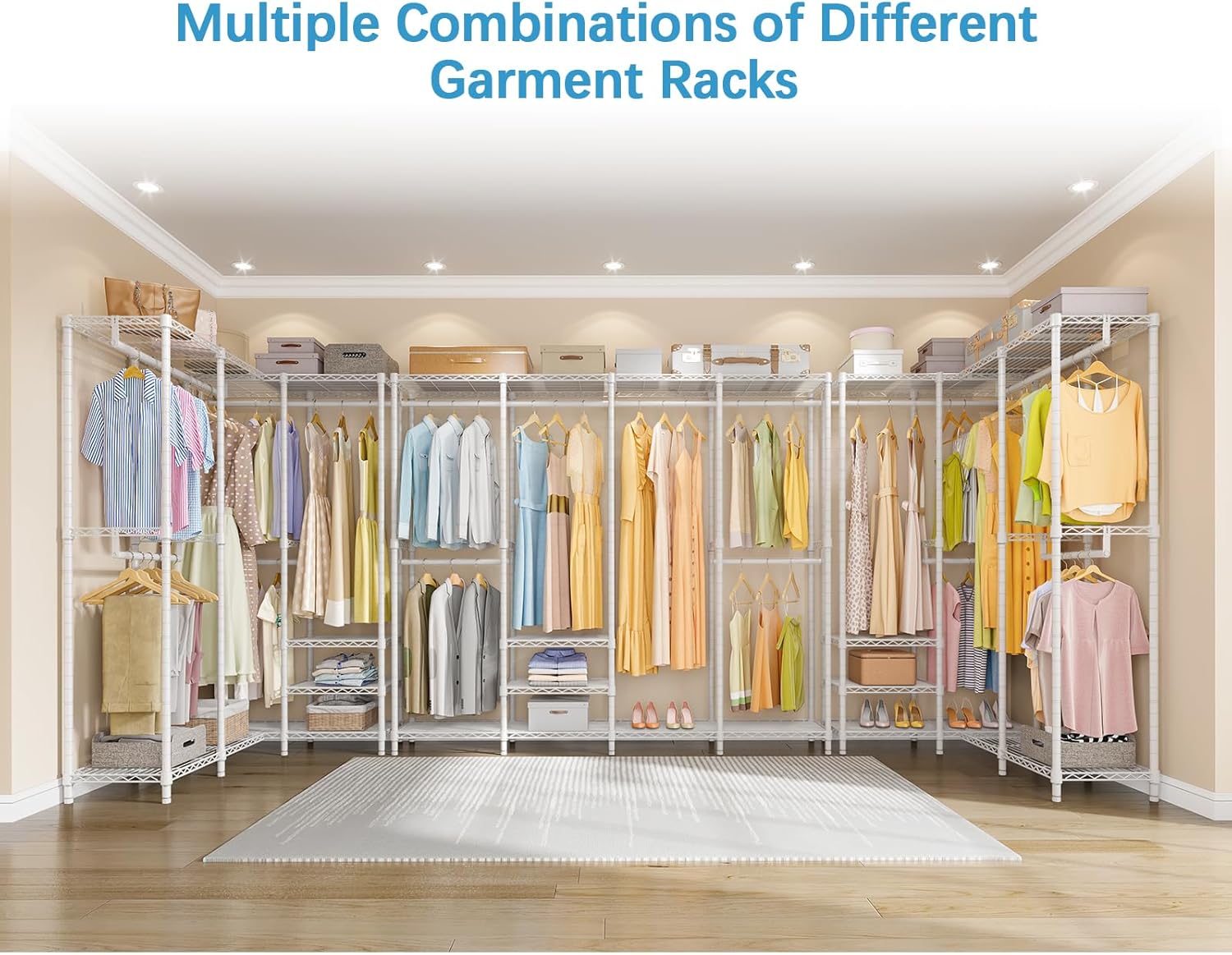 • All-in-one Multifunction Closet Rack: 4 Tiers Extra Large Garment Rack V40 offers you various storage area to place your clothes, accessories, shoes, etc. It features 6 height adjustable shelves for extra storage capacity, 4 detachable hanging bars that easily accommodates to the length and size of your garments.