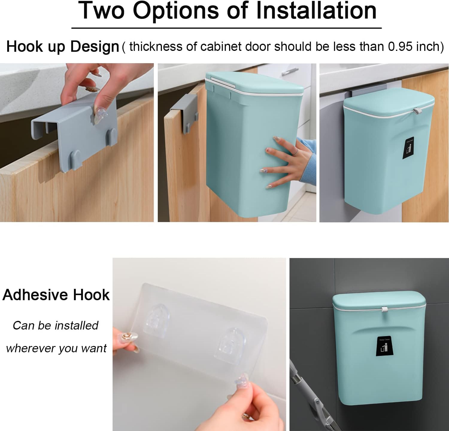 • Wall Mount Trash Can:" Trash bin is easy to install hanging, mount accessory ( 1 hook, 2 adhesive hooks and 20 pcs trash bag ) included, fit for most cabinet doors, pantry doors, cupboard, the thickness of the door should be less than 0.95 inch(2.5 cm); Our trash can is not only fit for kitchen countertop, but also fit under sink