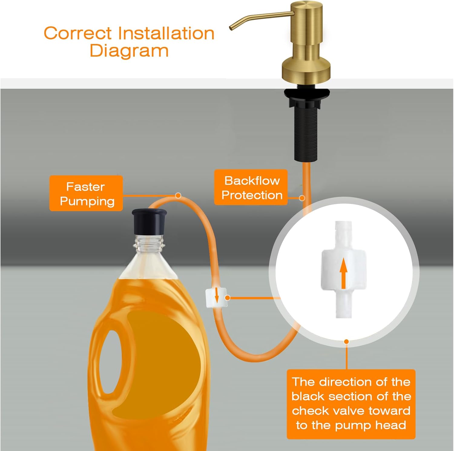 • What You Get: One soap dispenser pump head, 2 tubes, one bottle stopper to fit all soap containers, a check valve connects two-tube, anti-leak accessories and 3 fastening bolts.