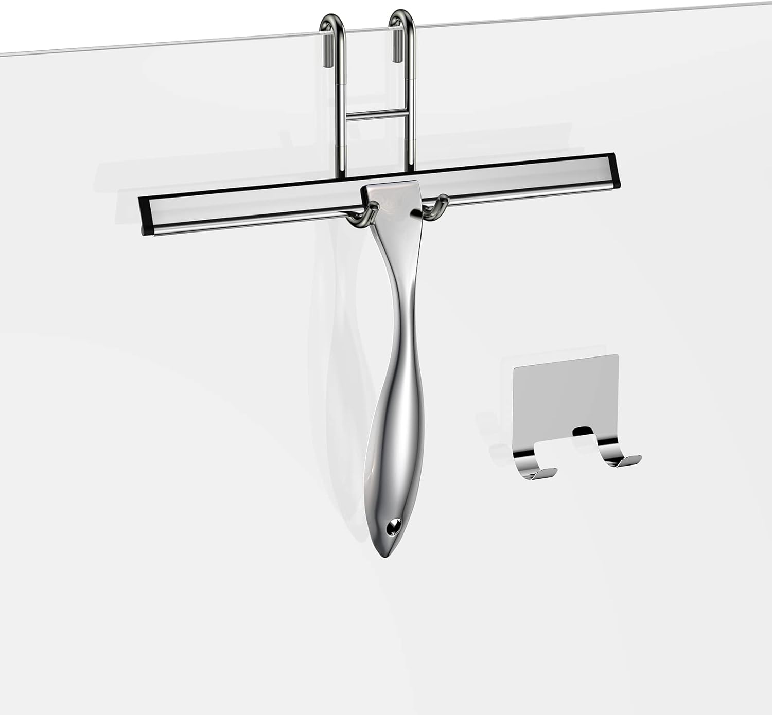 Shower Squeegee and Window Squeegee, Stainless Steel, 100% Streak-Free, Cleaner for Bathroom Showers Glass Doors, Home Mirrors, Car Windows Wiper, Adhesive Holder, Shower Door Hook, 10 Inch, Silver