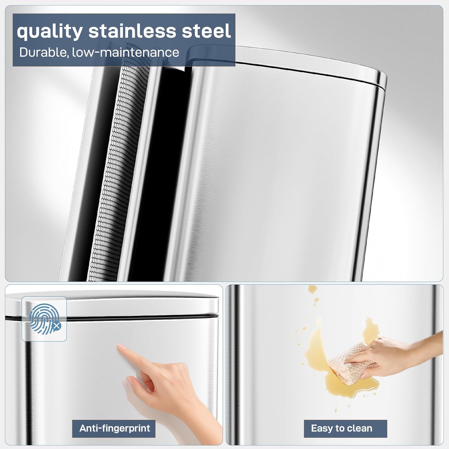 - 【410 Stainless Steel 】30/50L kitchen trash can is made of stainless steel and adopts a wire drawing process. It has a delicate appearance and is easy to clean. It also remains bright and new after long-term use. With the oval shape, it can add elegant and fashionable decoration to your home or office.
