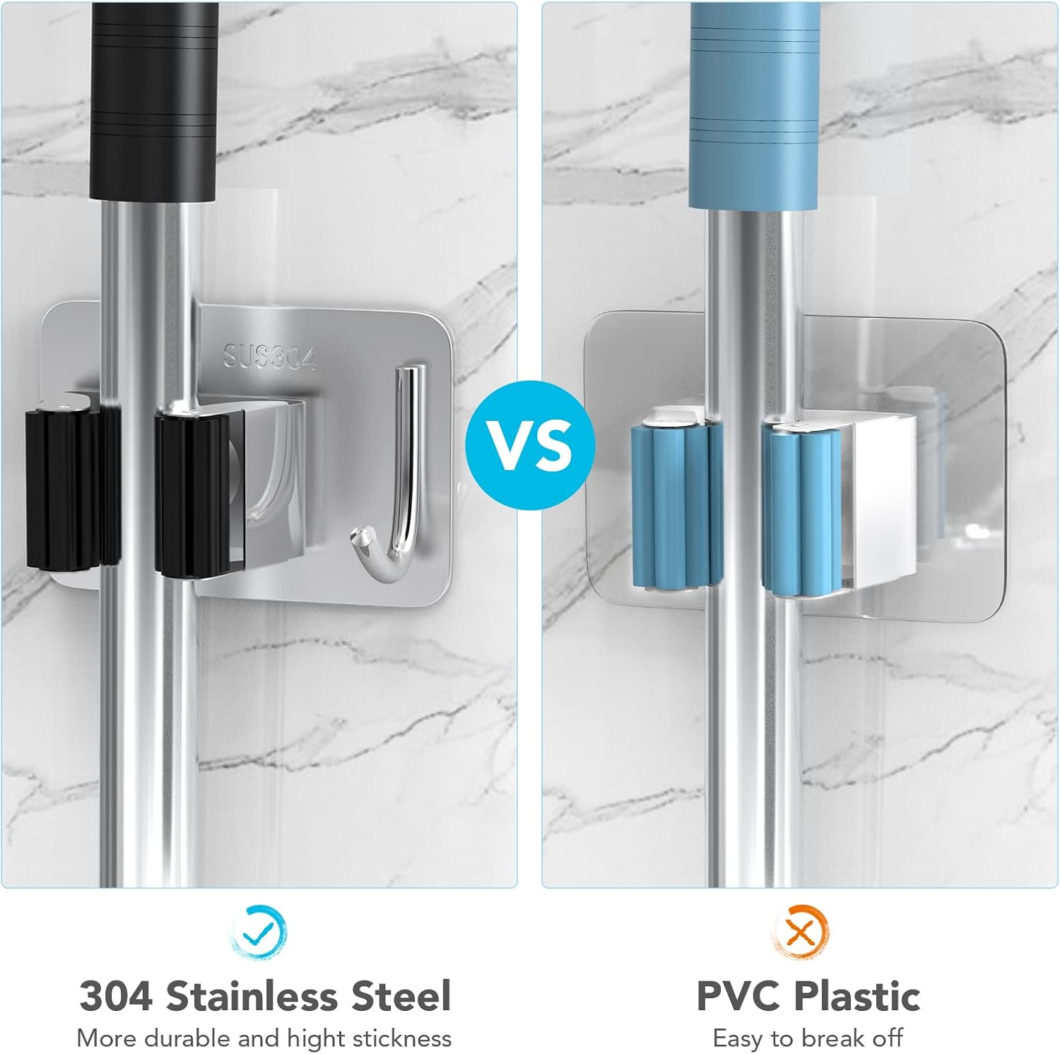 • ✔ Waterproof: HOMEASY self-adhesive broom holder wall mount is made of high quality SUS304 stainless steel, waterproof and rustproof. Triangle-buckle & petal-shaped gear adjust size automatically based on different thickness of the handles to prevent object slipping. Can stand up to 10 KG, more strong and sturdy than plastic holder