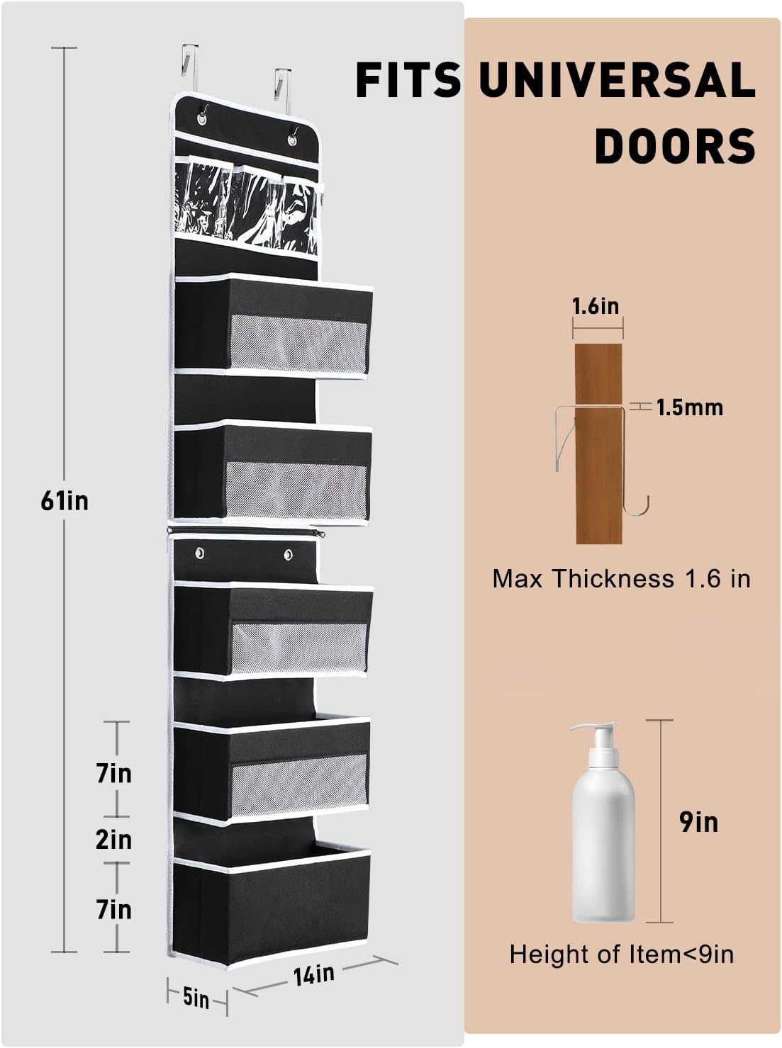 - Expanded to 61in Lx14in W: With 8 varying pockets, this large over door organizer stores more items than other door organizers having 7 or 5 pockets. Better fits your storage needs from organizing baby supplies, wipes, snacks, gloves, scarves, other grab-and-go necessities to stowing toiletries, clothes and other daily essentials