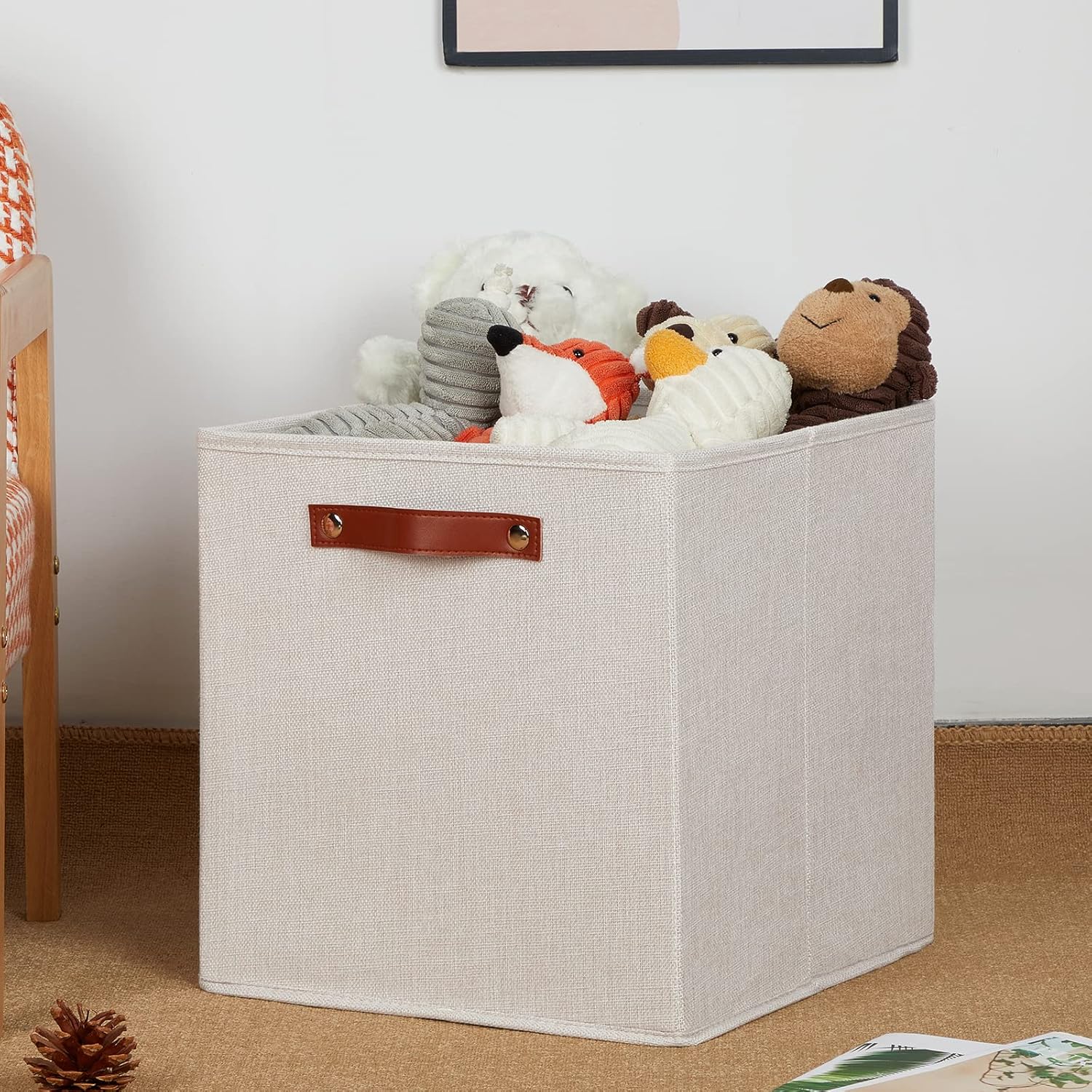 - 【Material】These cube storage bins are constructed of sturdy and attractive linen & cardboard with linen interior lining. The sturdy leather handles make it easy to carry or pull off and out of shelves.