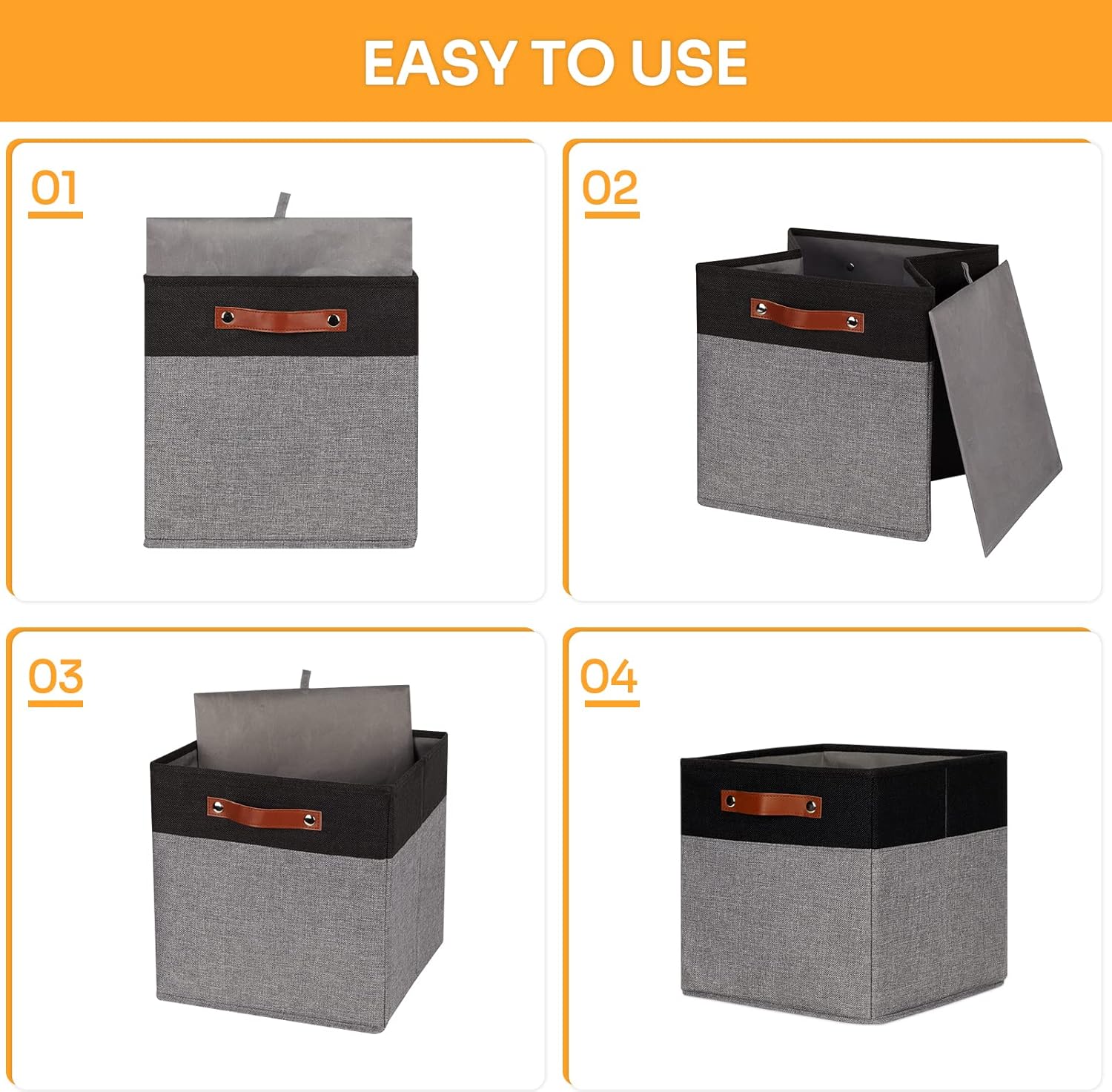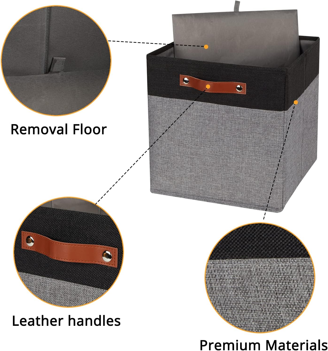- 【Material】These cube storage bins are constructed of sturdy and attractive linen & cardboard with linen interior lining. The sturdy leather handles make it easy to carry or pull off and out of shelves.