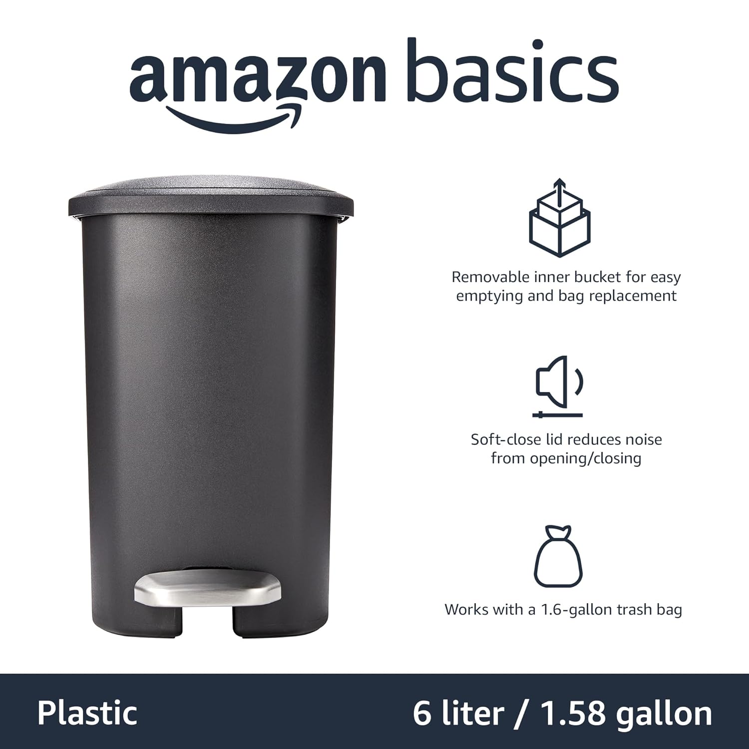 Amazon Basics Compact Plastic Bathroom Trash Can with Hands Free Foot Pedal, Quiet Close Step-On, 6 Liters, Black, Lid Included