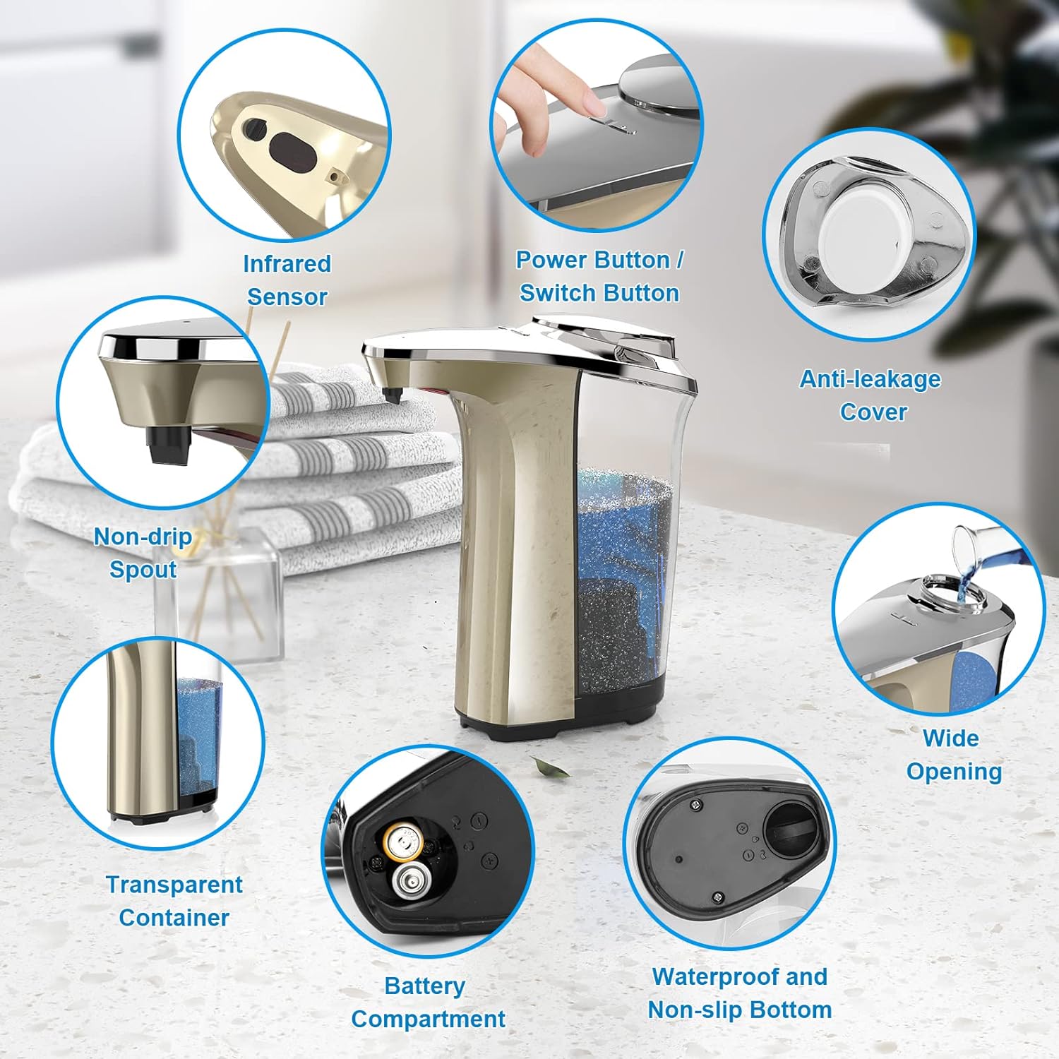 - [Automatic Soap Dispenser Touchless] Built-in upgraded infrared sensor, this hand soap dispenser can sense and dispense soap accurately when you place your hands under the sensor within the range of 0-2.36in. Hands-free and touchless features effectively avoid cross infection, make your washing more hygienic and safer. No-drip spout of the liquid soap dispenser minimizes clogging and prevents messy drips.