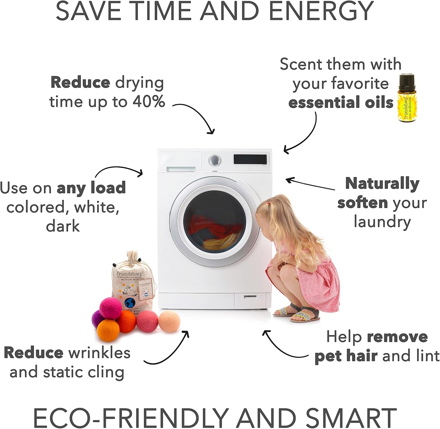 • ECO-FRIENDLY AND REUSABLE FOR 1000+ LOADS, replaces dryer sheets & liquid fabric softeners. Makes your laundry soft and fluffy, reduces wrinkles and static cling, and shortens drying time by up to 40% depending on load size. Your sheets and towels are fluffier, less balling and twisting. Makes you SAVE TIME, ENERGY, AND MONEY! All by keeping safe and healthy you, your family and the environment.