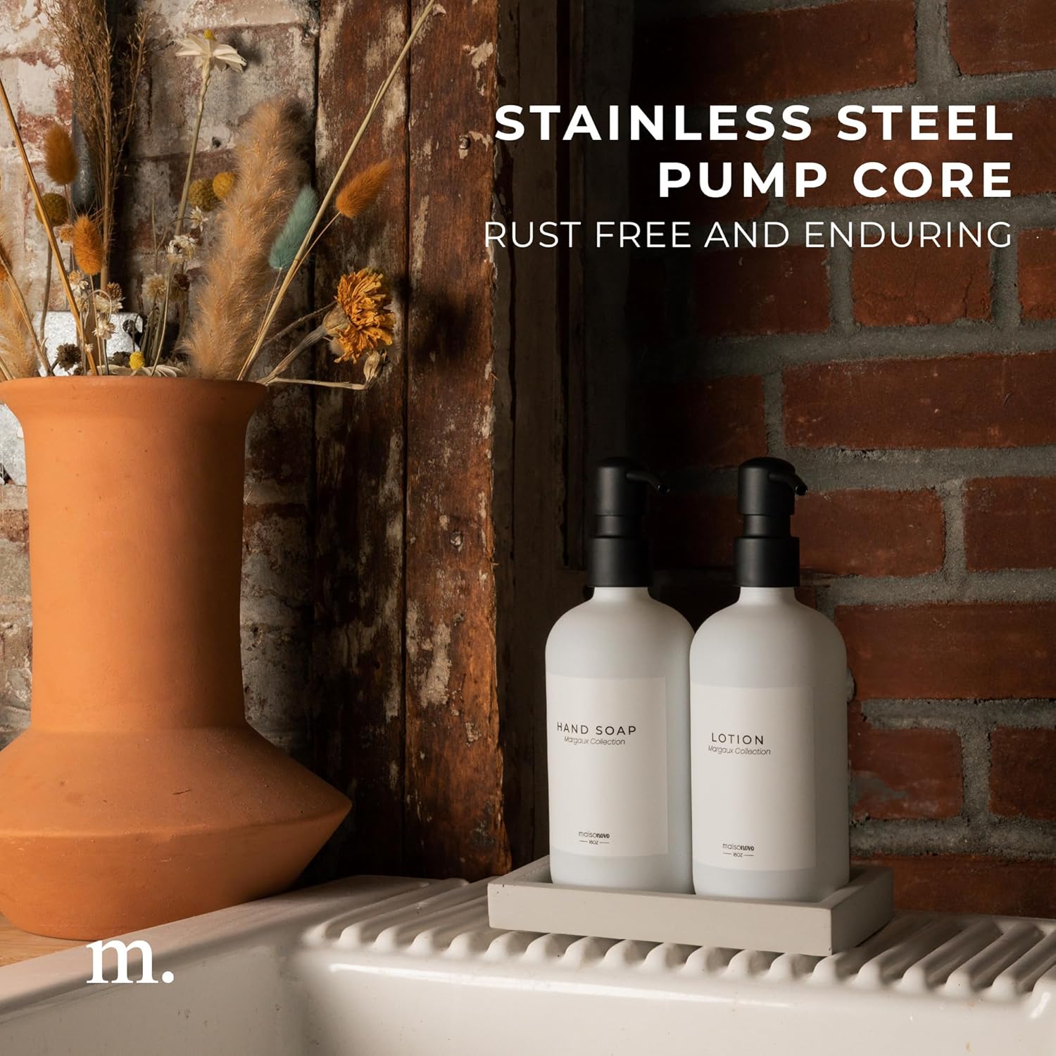 • Quality Materials: Designed in the USA and made with ISO14001 environmental standard these dispensers are crafted from premium quality glass and featuring a robust concrete tray, these soap dispensers are built to last. The waterproof labels are designed to withstand daily use, ensuring that your set remains both functional and beautiful over time.