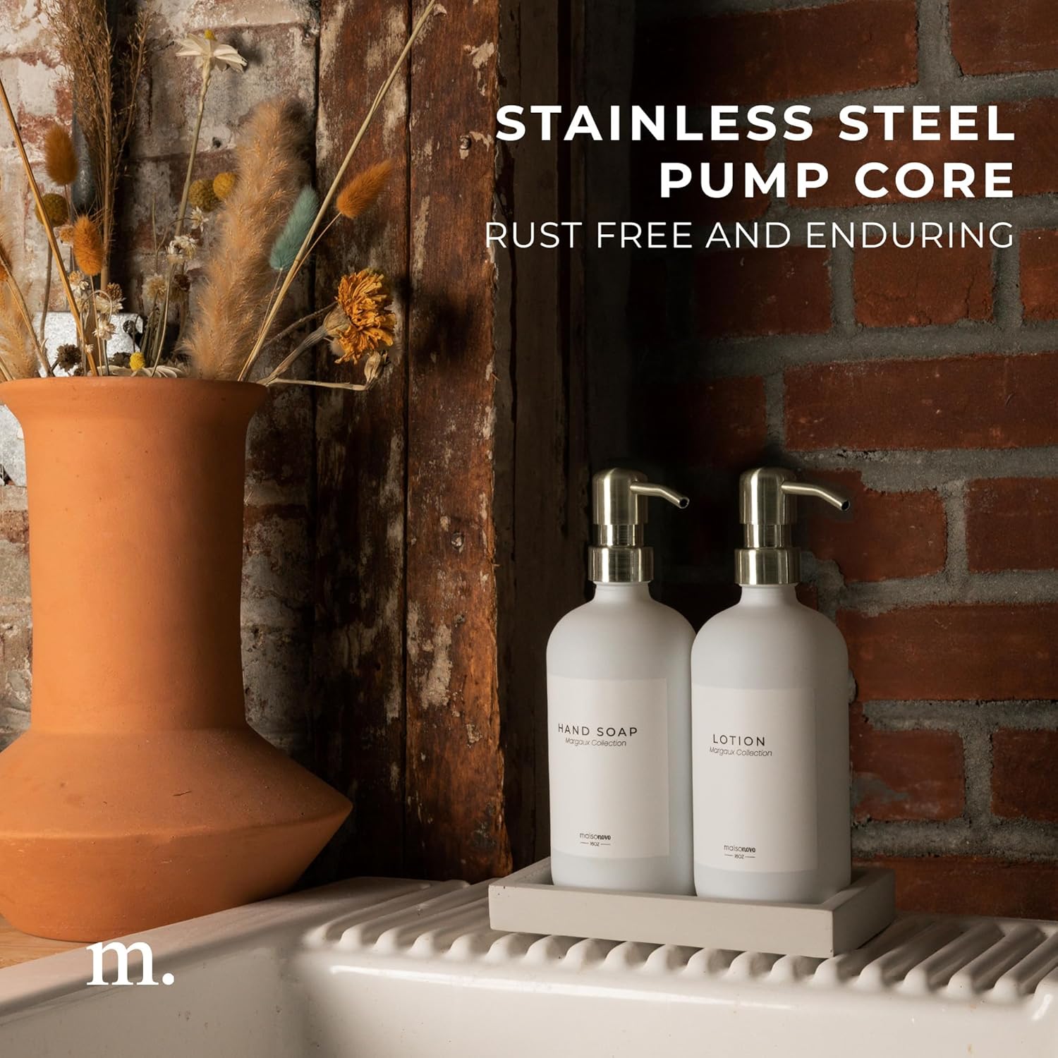 • This Pack Includes: Two white glass soap dispensers, which can hold 16.9 fl oz/500ml, with silver stainless steel pumps, a concrete tray, and durable waterproof labels (hand soap, body wash, dish soap, lotion, shampoo, conditioner), ensuring both style and practicality for your bathroom sink.