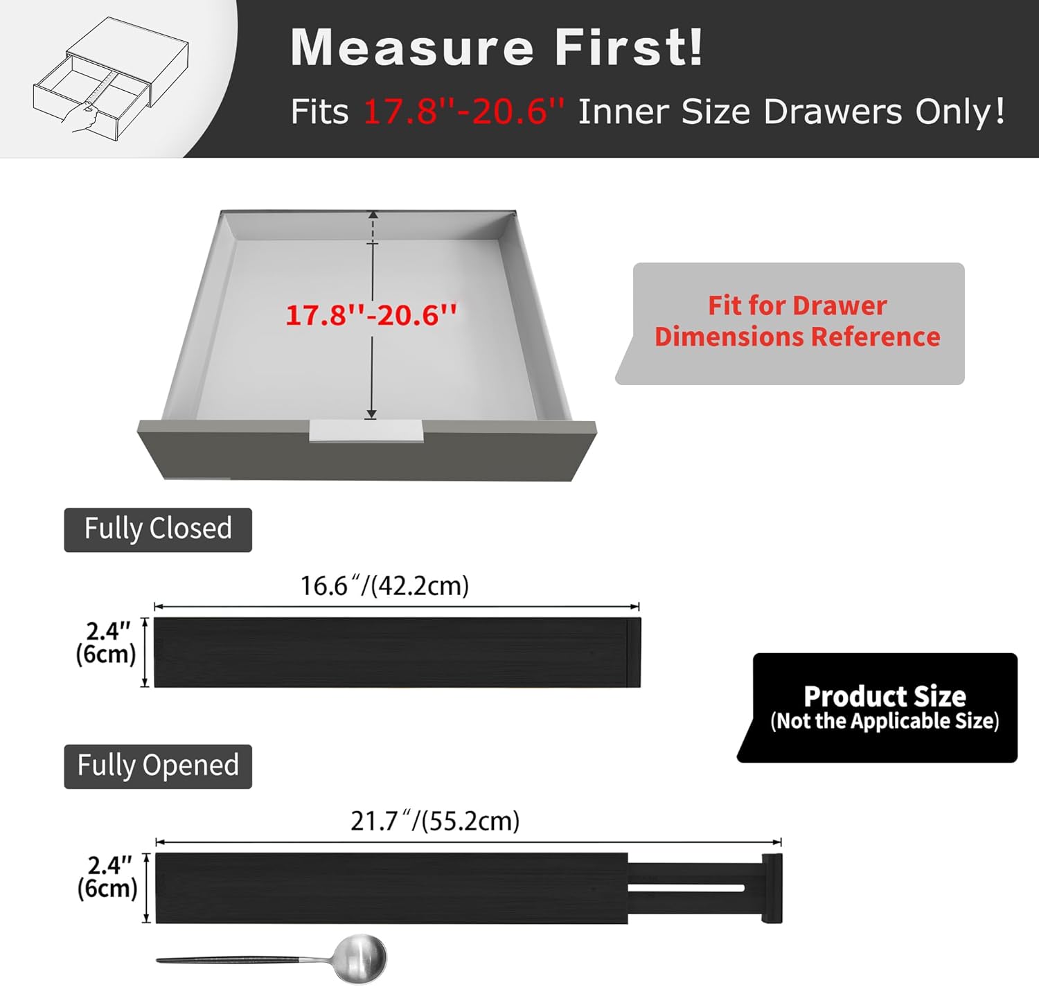 • Recommend Drawer Dimension: **Measure Your Drawers Before Buying!** This product is designed for drawers with an inner size of 17.8" to 20.6". If your drawer's inner size exceeds 20.6", it will doesn't work