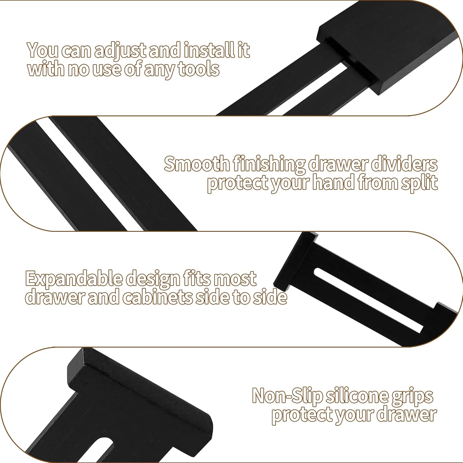 Utoplike 4 pcs Bamboo Kitchen Drawer Dividers Large, Adjustable Black Drawer Organizers, Spring Loaded, Works in Kitchen, Dresser, Bathroom, Bedroom, Drawer, Desk, 2.4" H