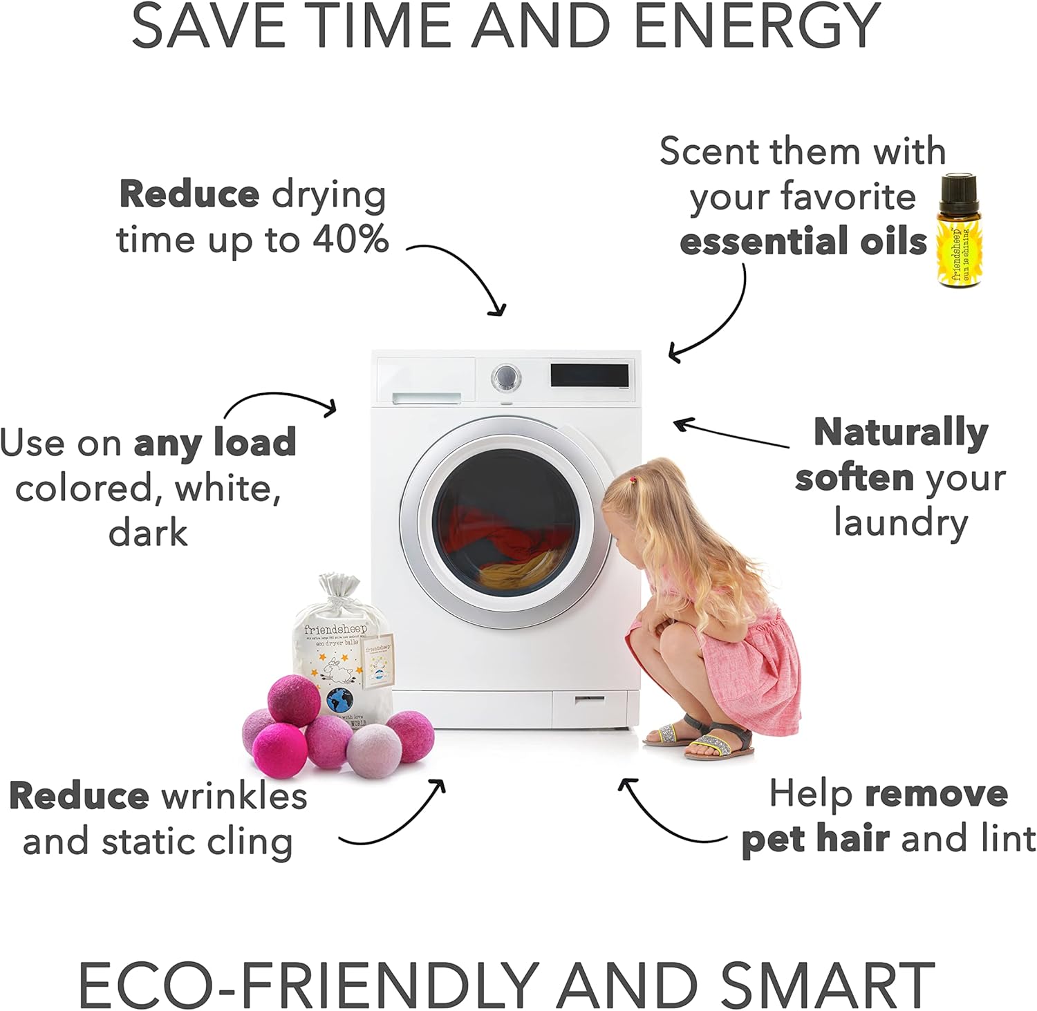• ECO-FRIENDLY AND REUSABLE FOR 1000+ LOADS, replaces dryer sheets & liquid fabric softeners. Makes your laundry soft and fluffy, reduces wrinkles and static cling, and shortens drying time by up to 40% depending on load size. Your sheets and towels are fluffier, less balling and twisting. Makes you SAVE TIME, ENERGY, AND MONEY! All by keeping safe and healthy you, your family and the environment.