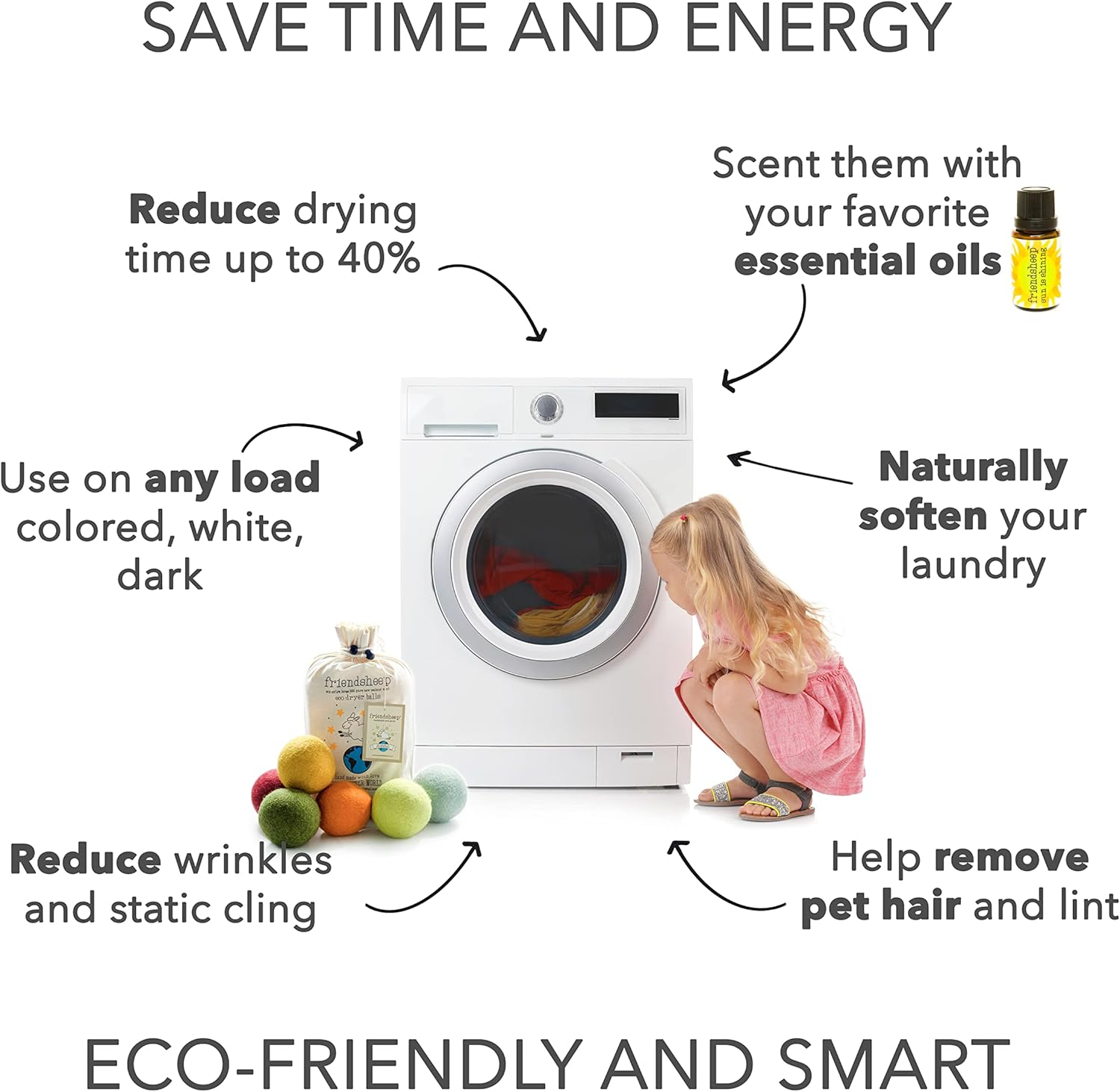 • ECO-FRIENDLY AND REUSABLE FOR 1000+ LOADS, replaces dryer sheets & liquid fabric softeners. Makes your laundry soft and fluffy, reduces wrinkles and static cling, and shortens drying time by up to 40% depending on load size. Your sheets and towels are fluffier, less balling and twisting. Makes you SAVE TIME, ENERGY, AND MONEY! All by keeping safe and healthy you, your family and the environment.