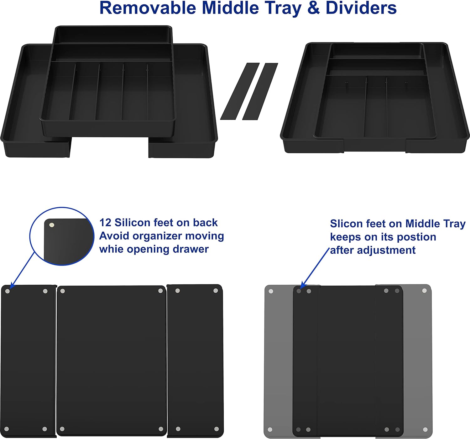 • Removable Middle Tray: Includes a detachable center tray, allowing the organizer to transform into 3 separate pieces for versatile use in different drawers.​