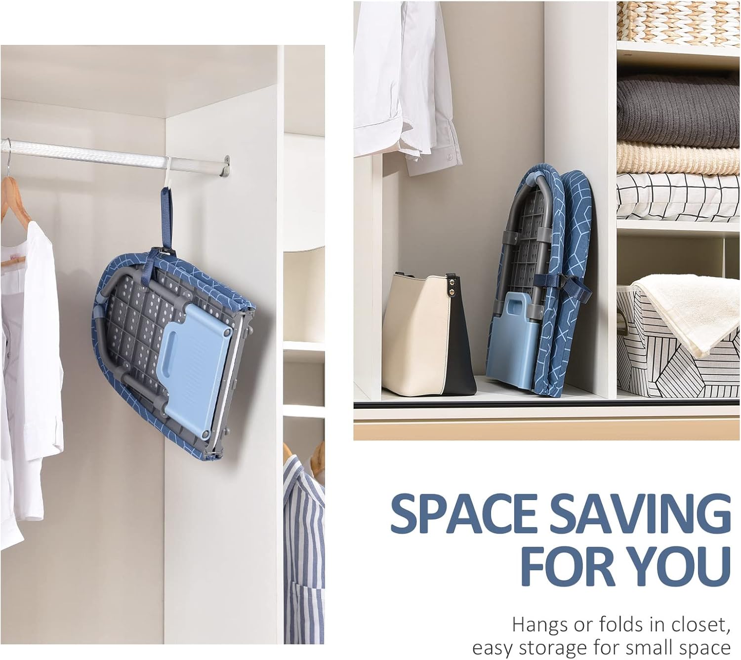 • AMAZING SPACE-SAVING- The unique folding allows the ironing board to fold completely in half. Expanded size: 32" x12.1" x4" After folding it is size 16" x12.1" x2.8" fit anywhere where space is limited. Only 3.4 lbs light weight and the latch with handle is easy to carry wherever you needed.
