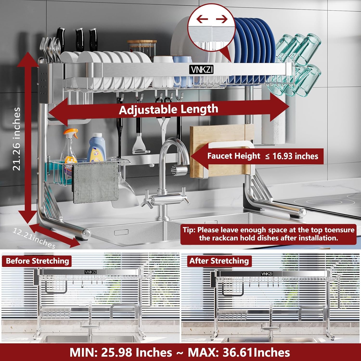 VNKZI Over Sink Dish Drying Rack, 2 Tier Full Stainless Steel Storage Adjustable Length (25.98'' to 36.61'') Kitchen Rack, Multifunctional Expandable Counter Organizer, Space Saver Dish Rack