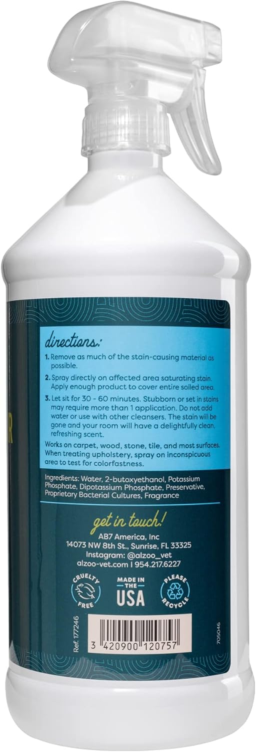 • QUICKLY ELIMINATES PET STAINS & ODORS -ALZOO Stain & Odor Remover is an easy-to-use spray with an effective blend of enzymes, probiotics, and plant-based cleansers that attack and destroy pet stains and odors. Eliminate the toughest pet stains & odors naturally.