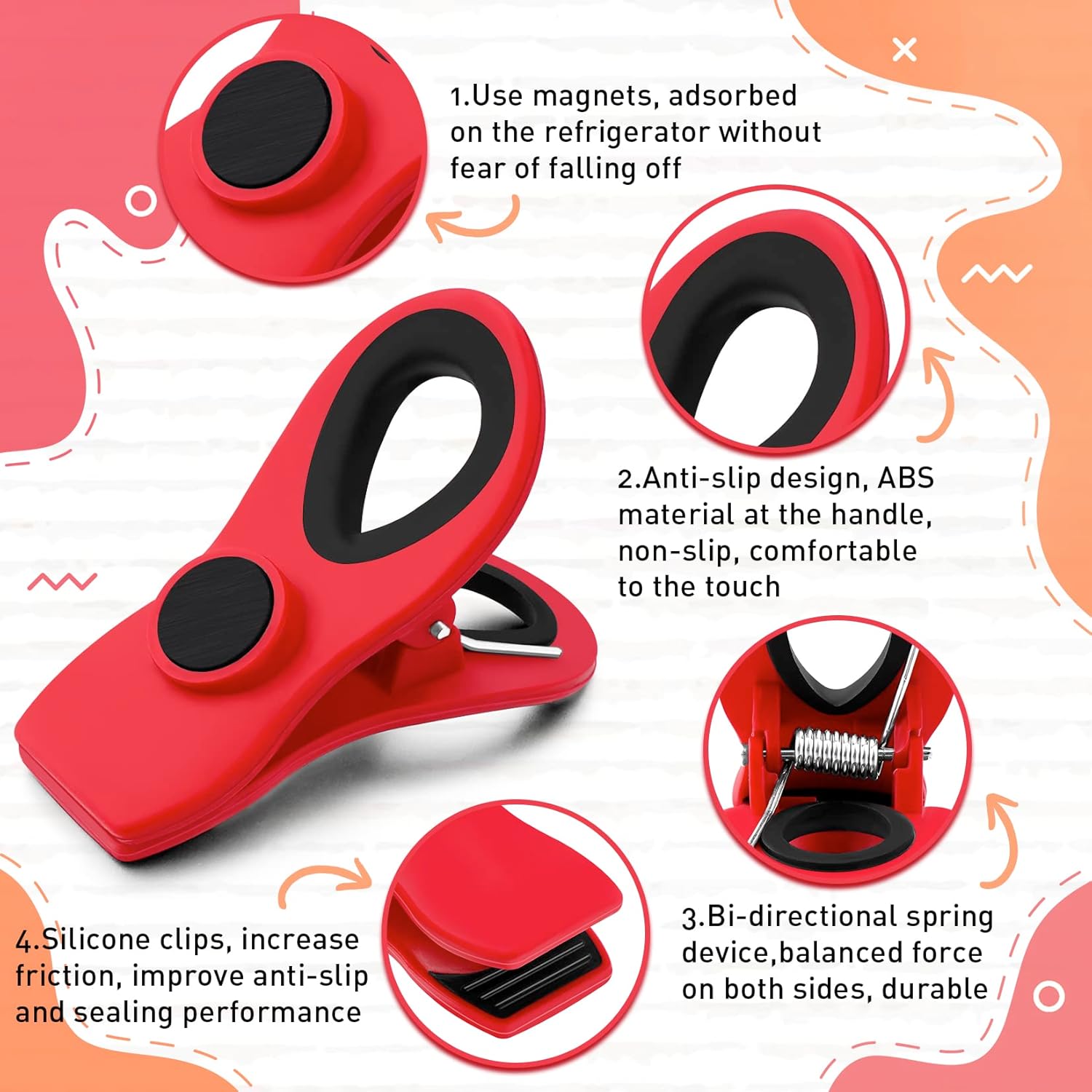 • Magnetic design: these chip bag clips are designed with a magnet on the back, which allow you to stick it on refrigerator, blackboard, glass and other surfaces, easily display your photo, daily schedule, artwork, memo notes and other small items, not easy to slip or fall off