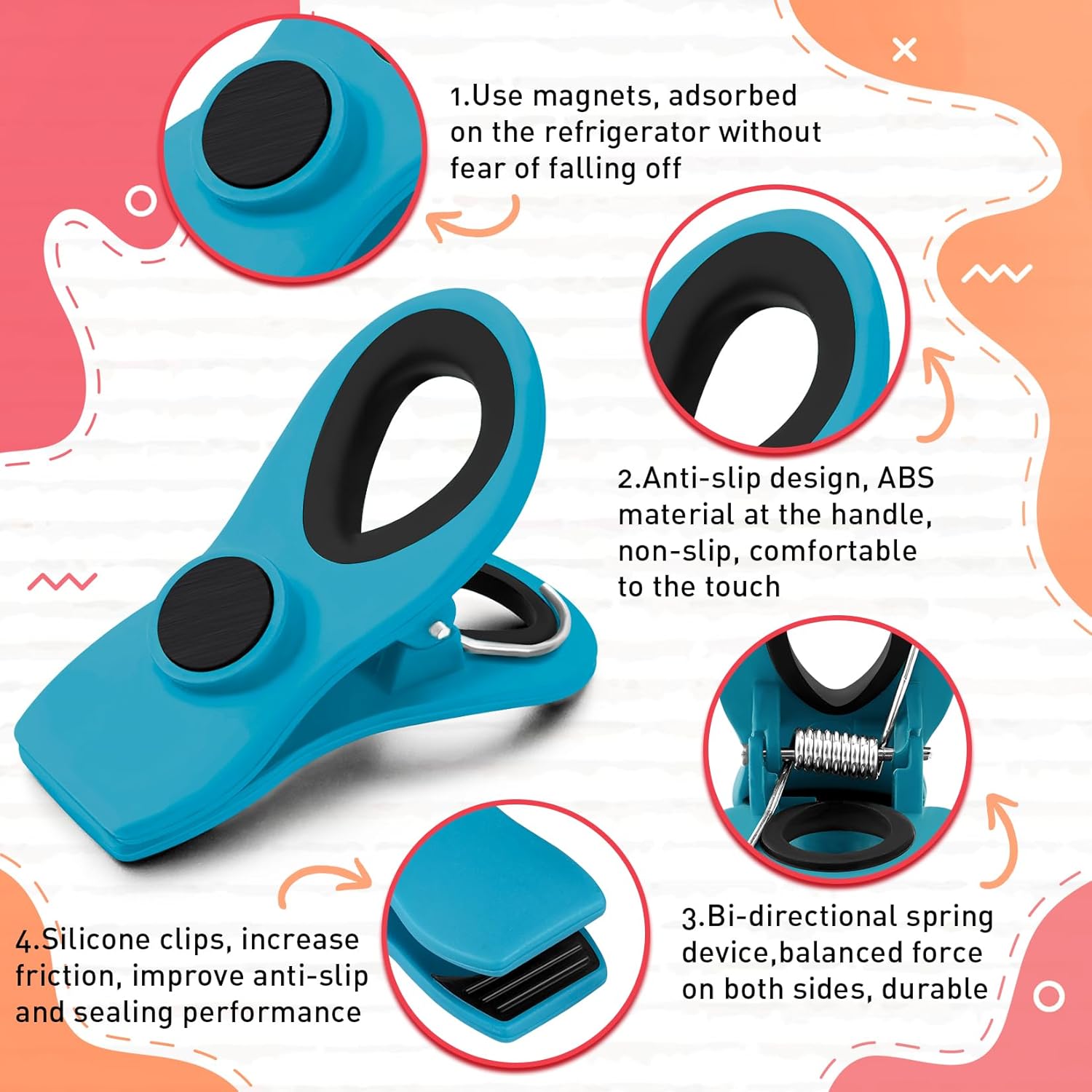 • You will receive: Set includes 12 Blue magnet clips with soft touch handles - the perfect shape and size clip for all different sized bags of chips and food. sufficient quantity for you daily using and replacing demands, also nice to share with your family and friends who need it