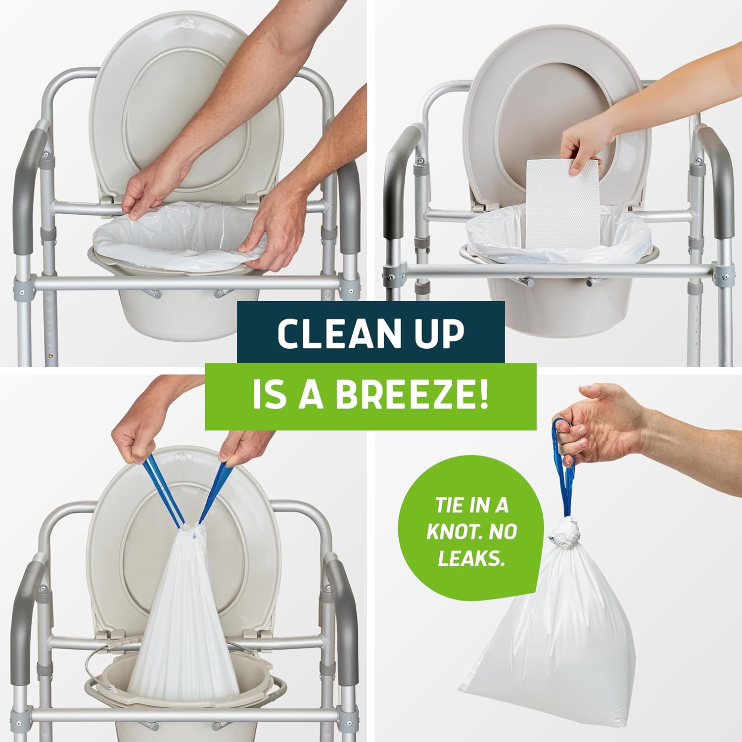 • Easy To Use And Easy To Dispose Of: Simply remove the commode liner with the aloe scented super absorbent pad by pulling on the strings, tie up the bag opening to eliminate odors, and easily dispose of them. They just make clean up a breeze.