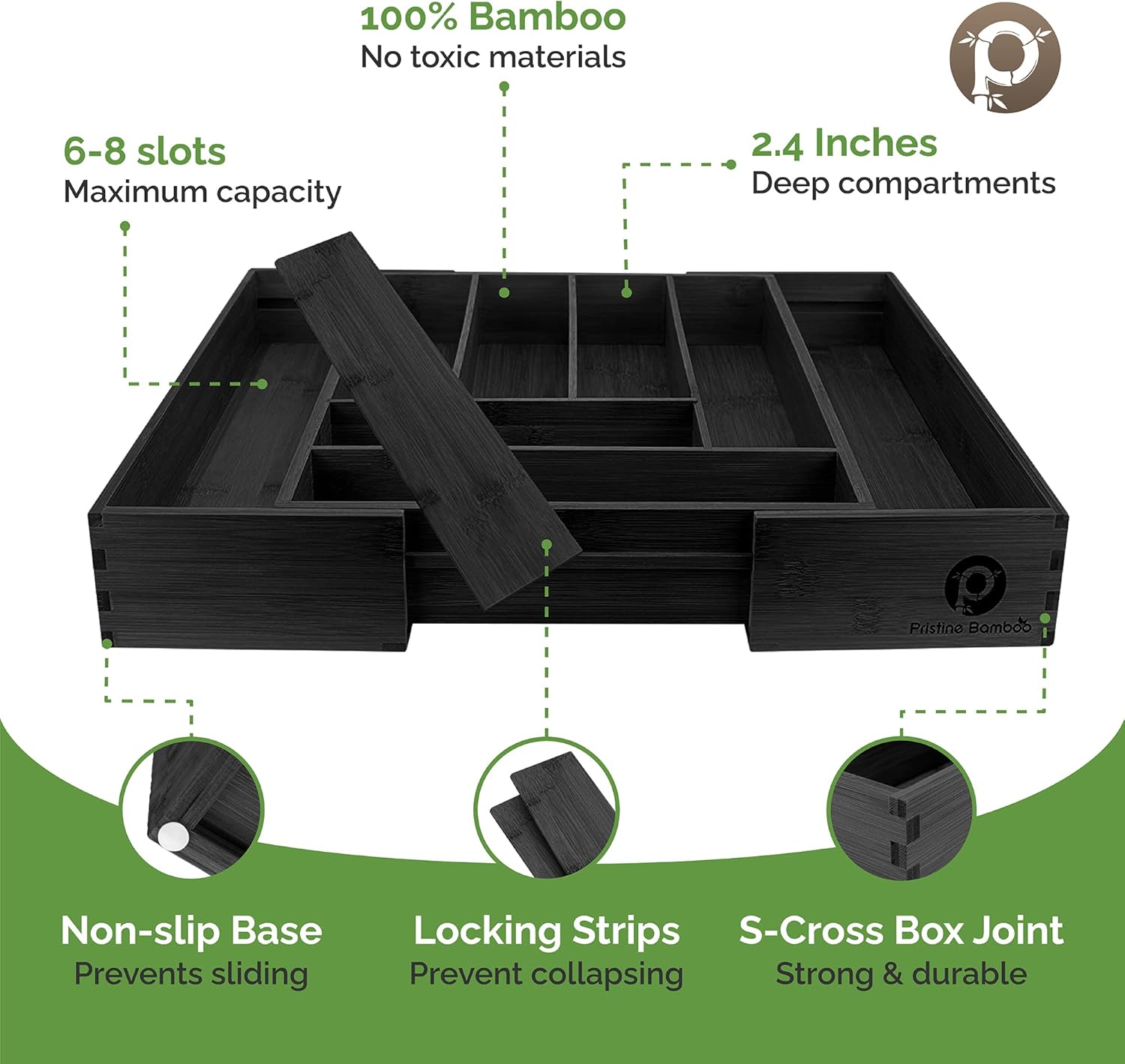 Silverware Tray - Drawer Organizer with Expandable Wooden Dividers (8-Slots, Black)