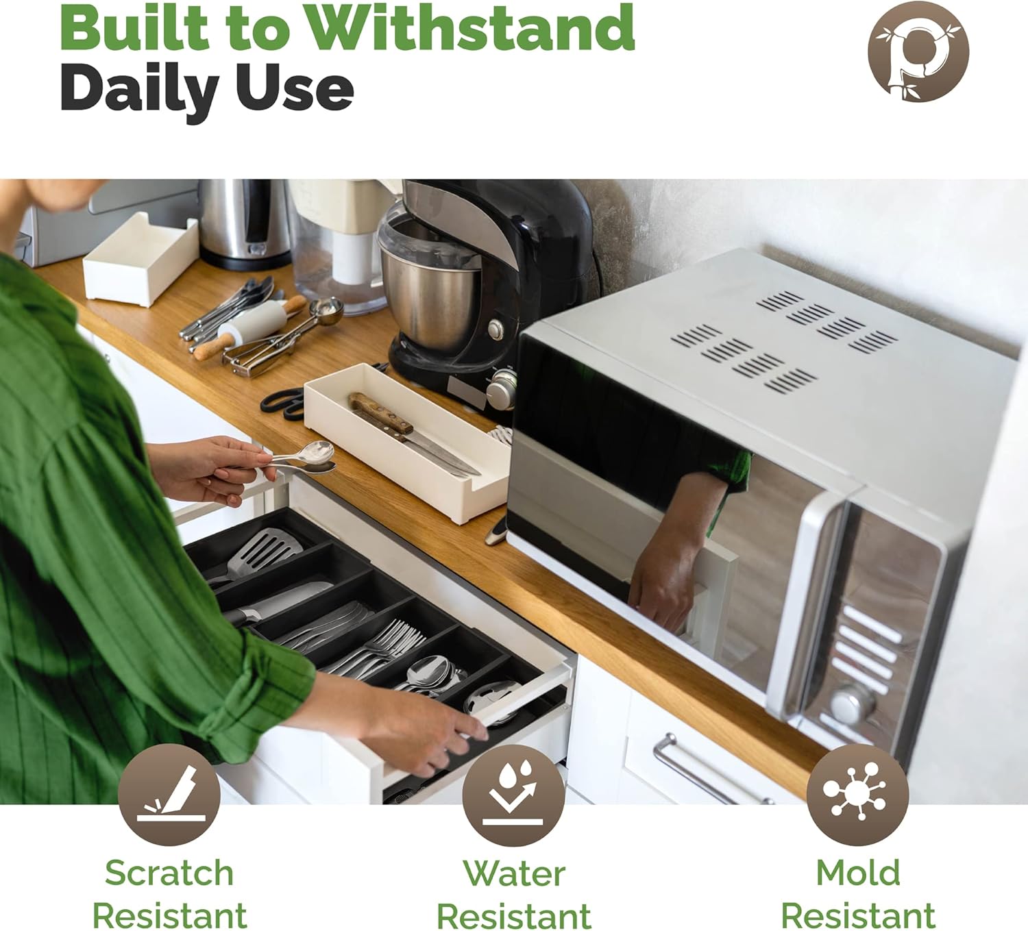 • PERFECT STORAGE SOLUTION: Composed of 6-8 compartments, this silverware tray insert provides optimal spaces with flexible side dividers that expand from 12.5 inches to 19.3 inches wide. Our extendable wooden dividers provide up to 37% extra storage capacity to accommodate multiple eating and cooking utensils.