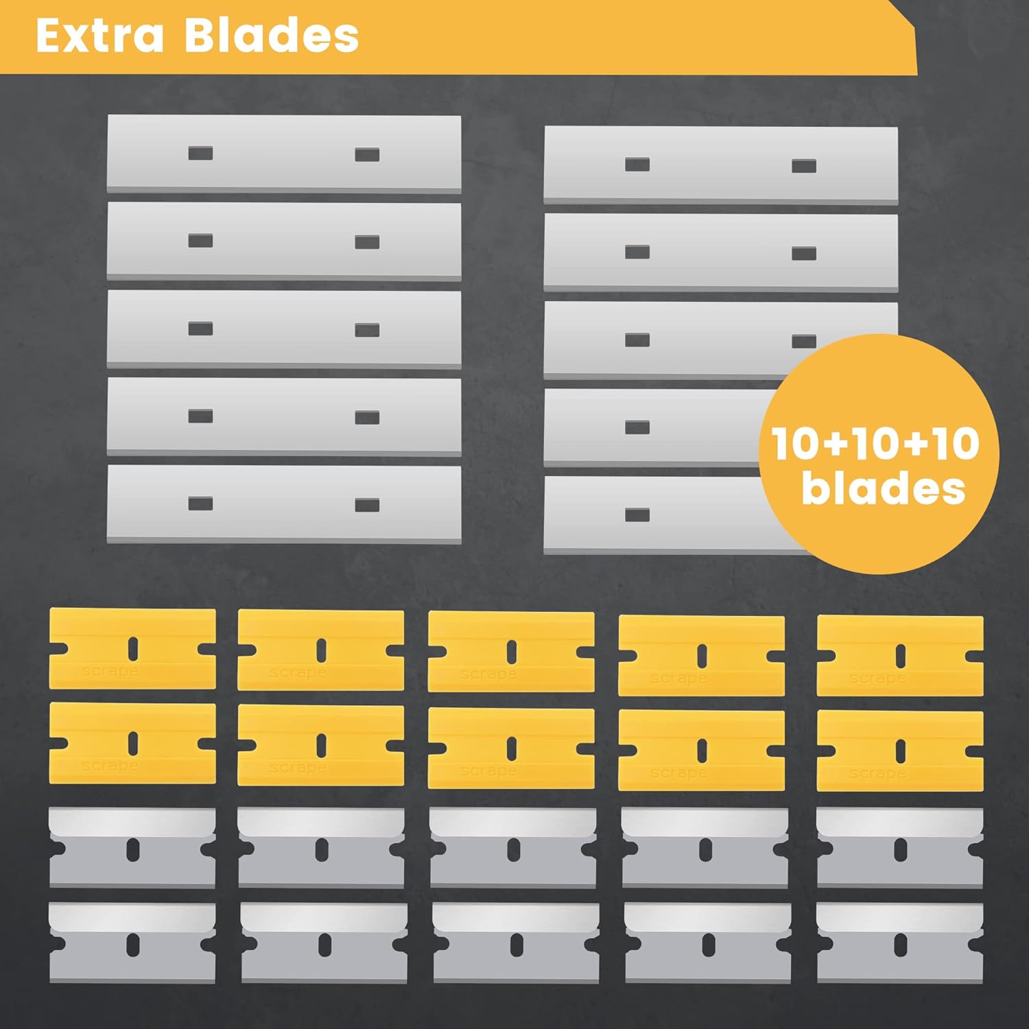 • SCRAPER TOOL SET: 1Pack 4" Glass Scraper, 1Pack standard Window Scraper, 1Pack mini Blade Scraper, 10pcs 4" razor blades, 10pcs standard metal razor blades, 10pcs plastic razor blades.With it, it can meet all your needs, it is the most comprehensive and indispensable set combination