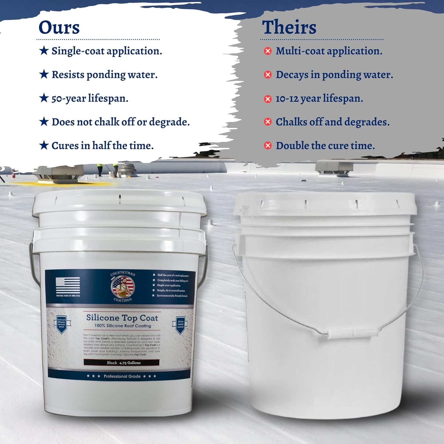 - RESTORE, PROTECT, AND EXTEND THE LIFE OF YOUR ROOF - Countryman Coatings Silicone Top Coat can be applied via roller, brush, or spray equipment directly to: Metal, Modified-bitumen, EPDM, Smooth-surface built-up, Gravel surface built-up, Single-ply (PVC, TPO), Granulated cap sheet, Spray foam, Concrete, Acrylic coatings, Silicone coatings, Elastomeric roof coatings, Urethane coatings, and more. If your roof is aging or failing but in good structural condition, Countryman Coatings can help.