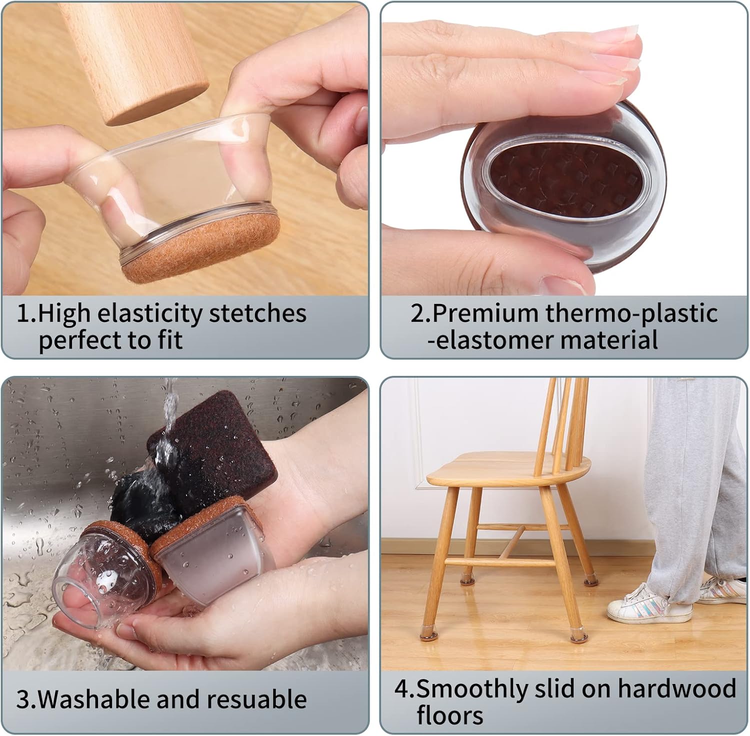 • ☛【Not Easy to Fall Off】- Chair leg cups is made of premium soft thermo-plastic-elastomer material, which is stretchable. They are easy to slip-on, no need to stick, and have strong adhesion, it tightly wrap legs, and not easy to fall off.
