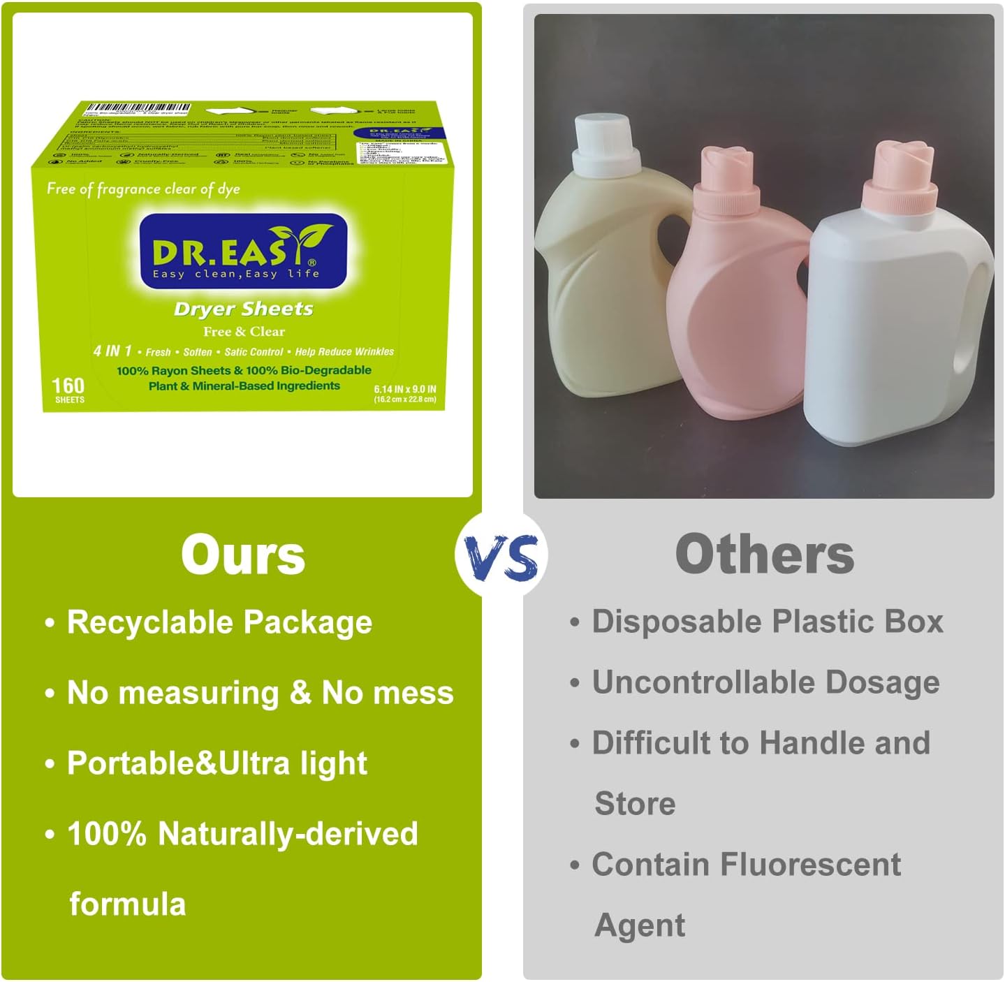 Dr.Easy Dryer Sheets Free & Clear Plant Based all ingredients for Sensitive Skin 160 Ct 100% Rayon Fabric Softener sheet unscented & no dyes Reduce Static & Wrinkles Soften Clothes Help Repel Pet Hair