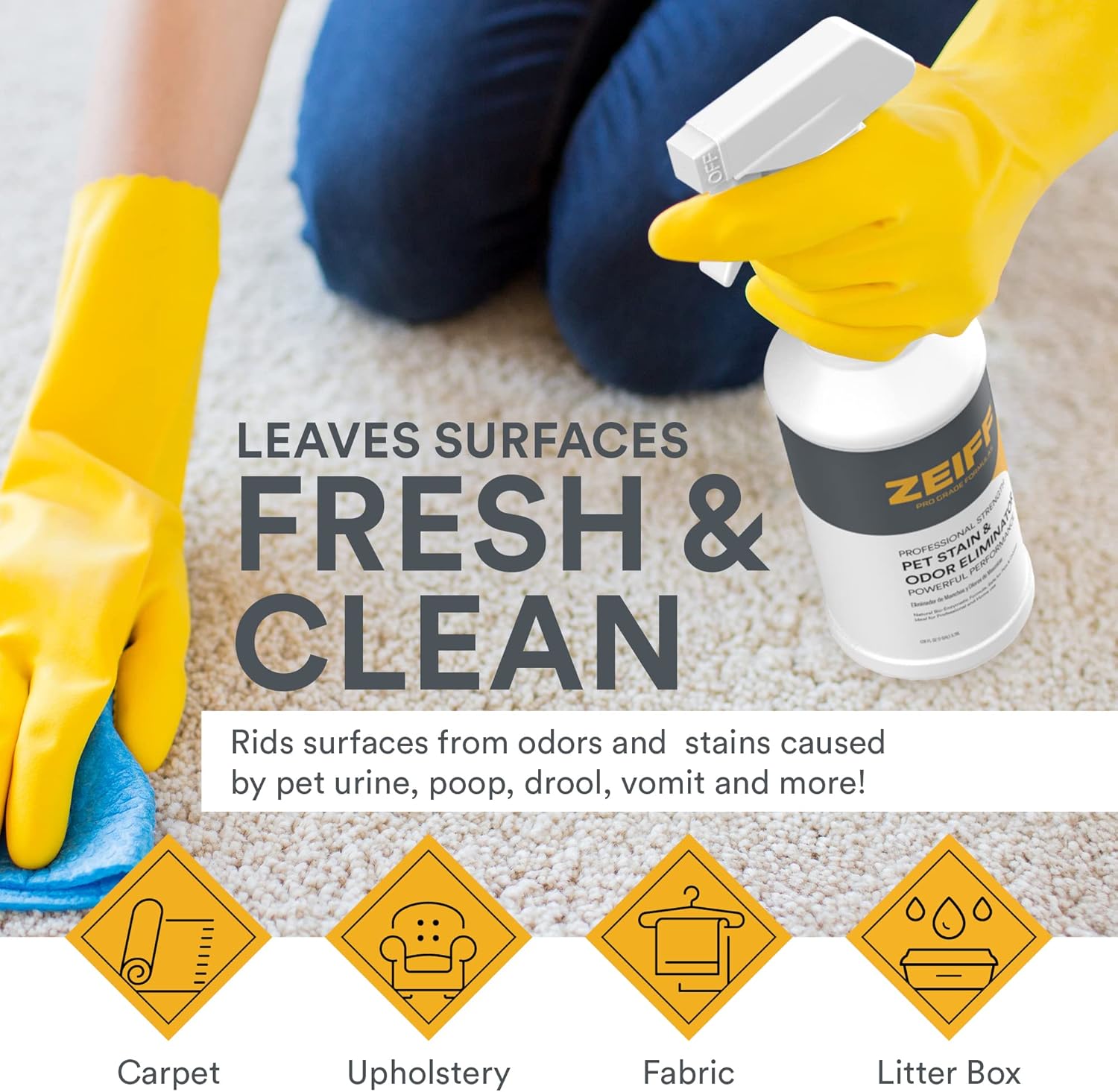 • ELIMINATES ODORS, & STAINS – Zeiff carpet cleaner for pets gets rid of stains and stink, eating through organic matter such as dog urine, cat pee, feces, vomit, blood, and drool. Our premium pet carpet cleaner is available in a quart spray bottle or gallon size.