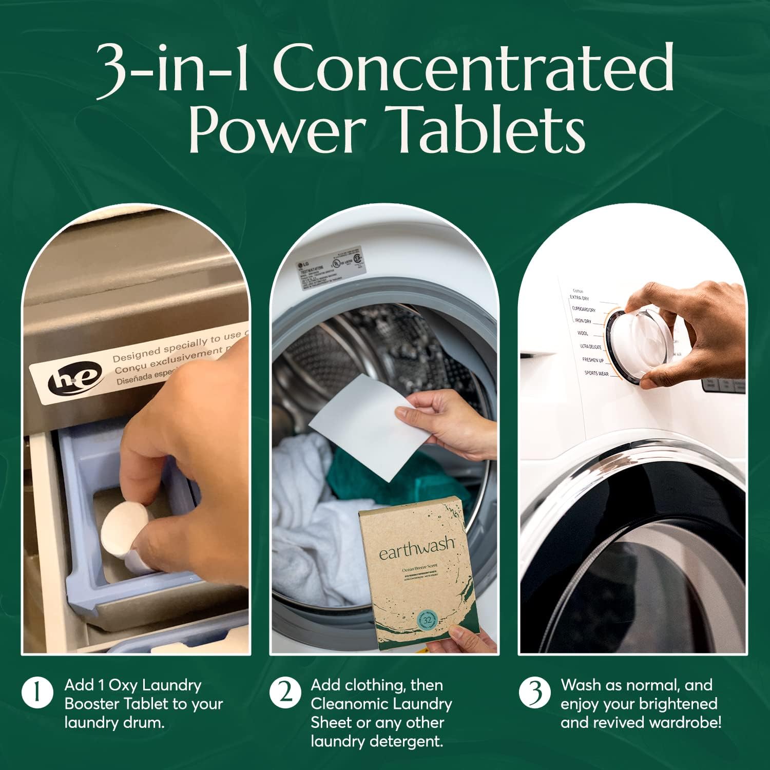 • First, add one Oxy Laundry Booster Tablet into your washer, then add clothes and Earthwash or your favorite detergent. Finally, wash as normal and enjoy your revived and brightened wardrobe with our laundry whitener brightener!