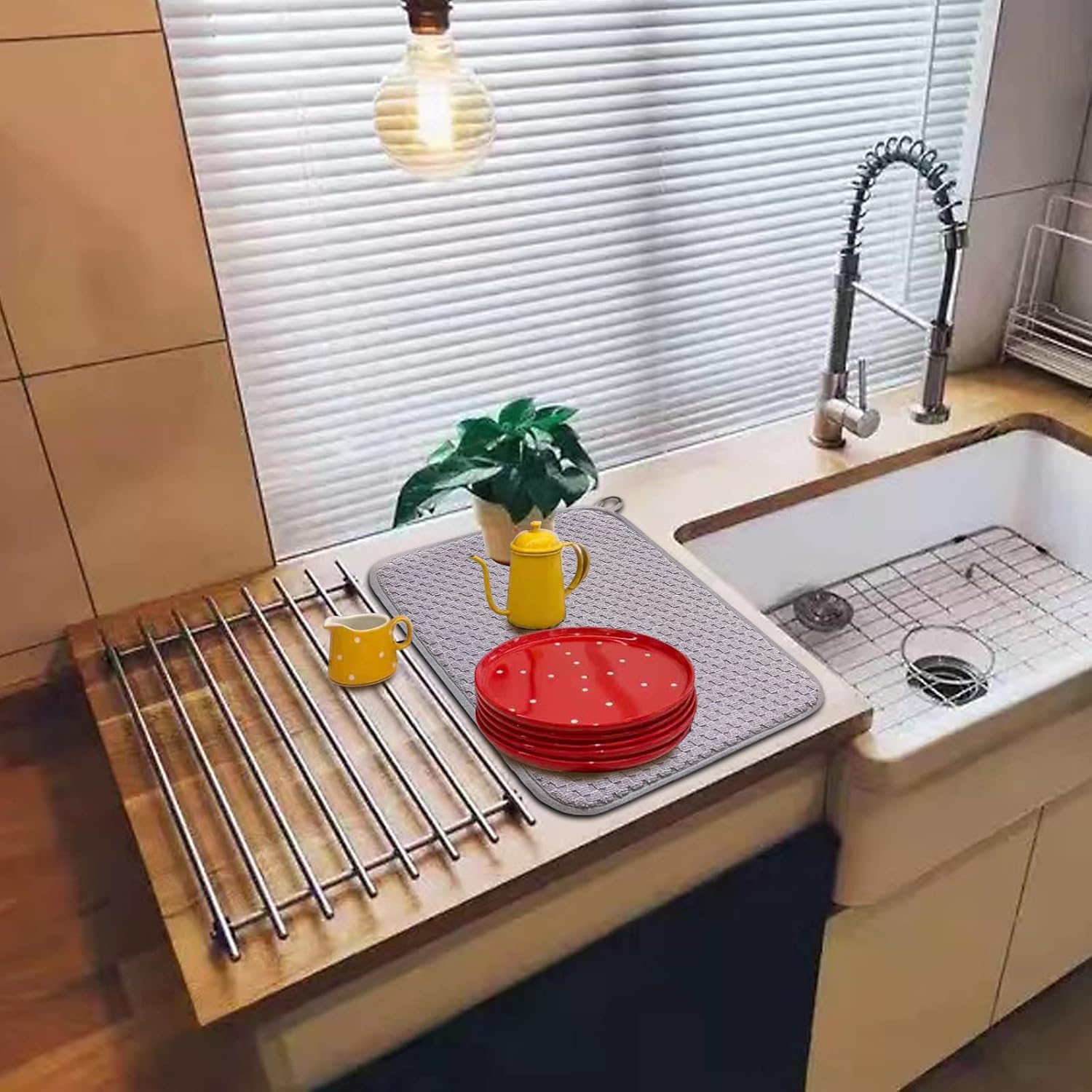 • 【Drying Hanger & Easy to Store】 The grey dish drying mats come with a corner hanger to dry. Fold up and put in the drawer when not in use. Can be easily folded or flattened. The hanger is by the corner of the mat, save space when hanging
