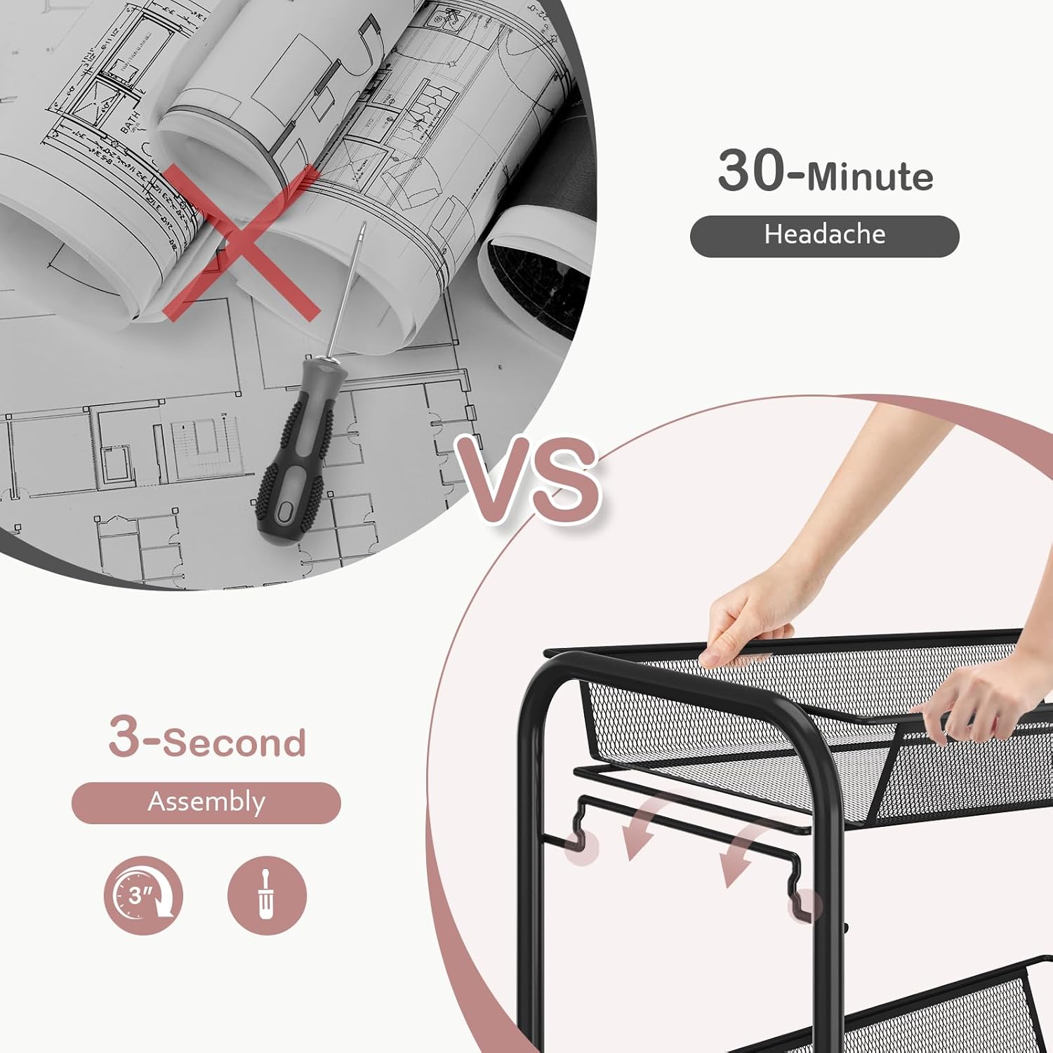 • 【Easy Assemble & Extra Storage】This utility cart doesn't need tools to installate, so you can easily and quickly assemble the cart, just need snap the units together within minutes. 3 free side hooks for additional storage, like bath ball, wipes, scissors etc. It's clearer than put items in drawers.