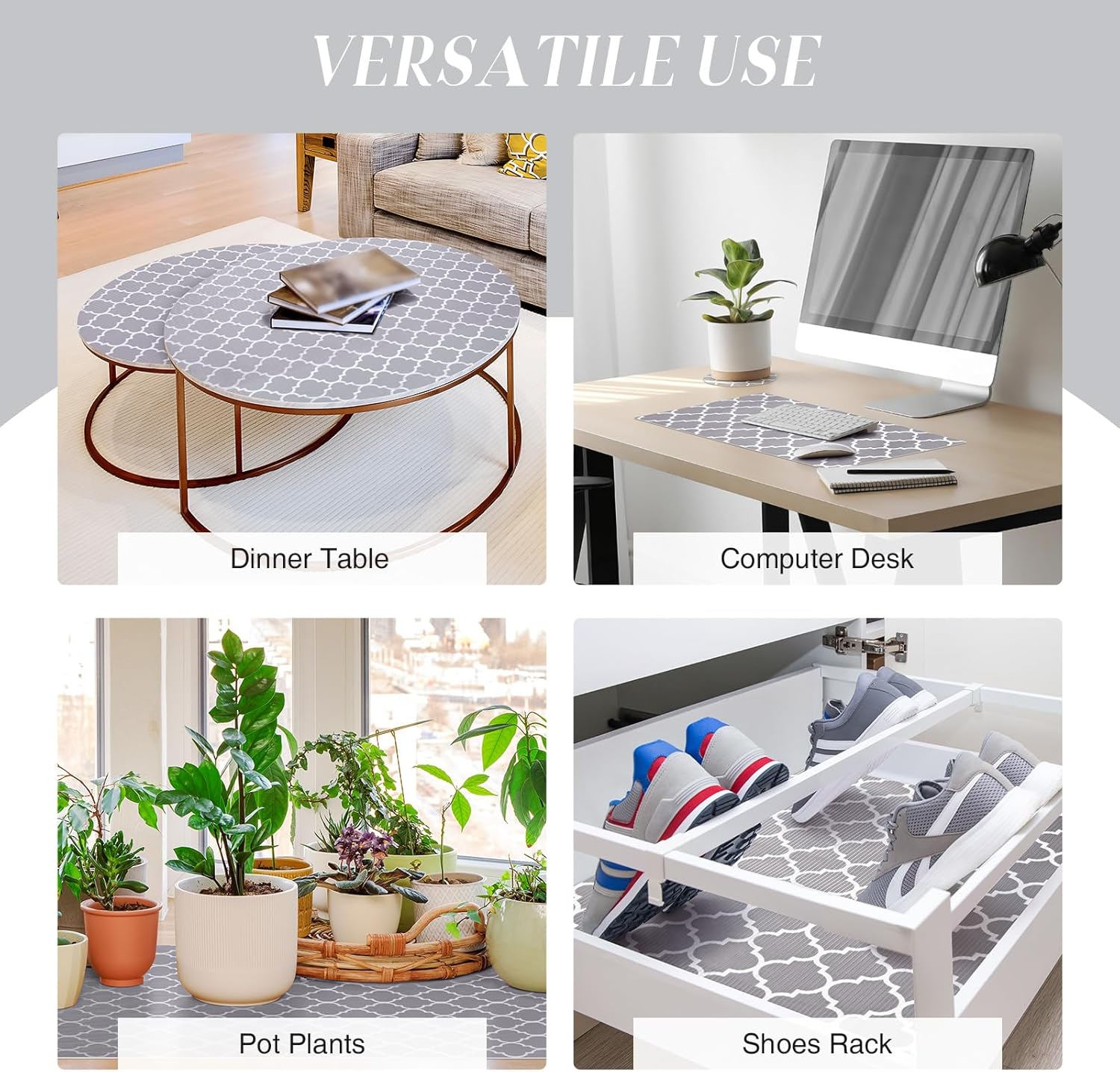 - 👍 PERFECT STORAGE SOLUTION- These shelf liner come in 17.5" x 30 ft. Made of eco-friendly EVA material and feature a non-slip design, the shelf liners for kitchen cabinets help prevent spillage by keeping your items locked into place and free from unwanted dirt and debris. The plastic drawer liners for dresser is ideal for use in a top drawer, bedroom dresser, bathroom cabinets, kitchen cabinets and desk drawers for organizing and protecting small items from damage or scratches.