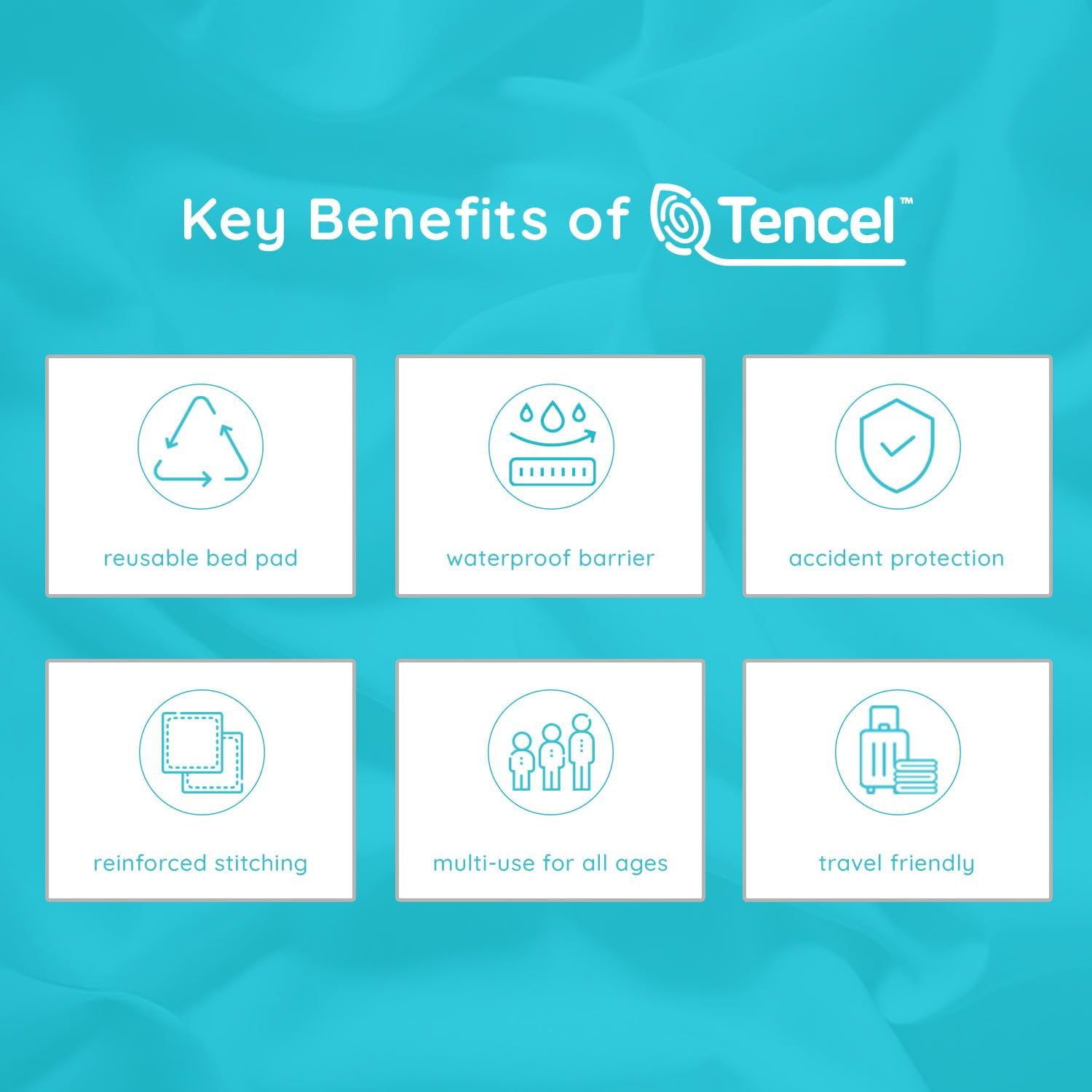 • 100% TENCEL Cover: Crafted with TENCEL, a botanic and pure fiber derived from eucalyptus trees, this waterproof bed pad provides a soft, breathable surface for kids, families, and pets. TENCEL absorbs 70% more moisture than cotton, keeping surfaces dry and comfortable during potty training or nighttime accidents.