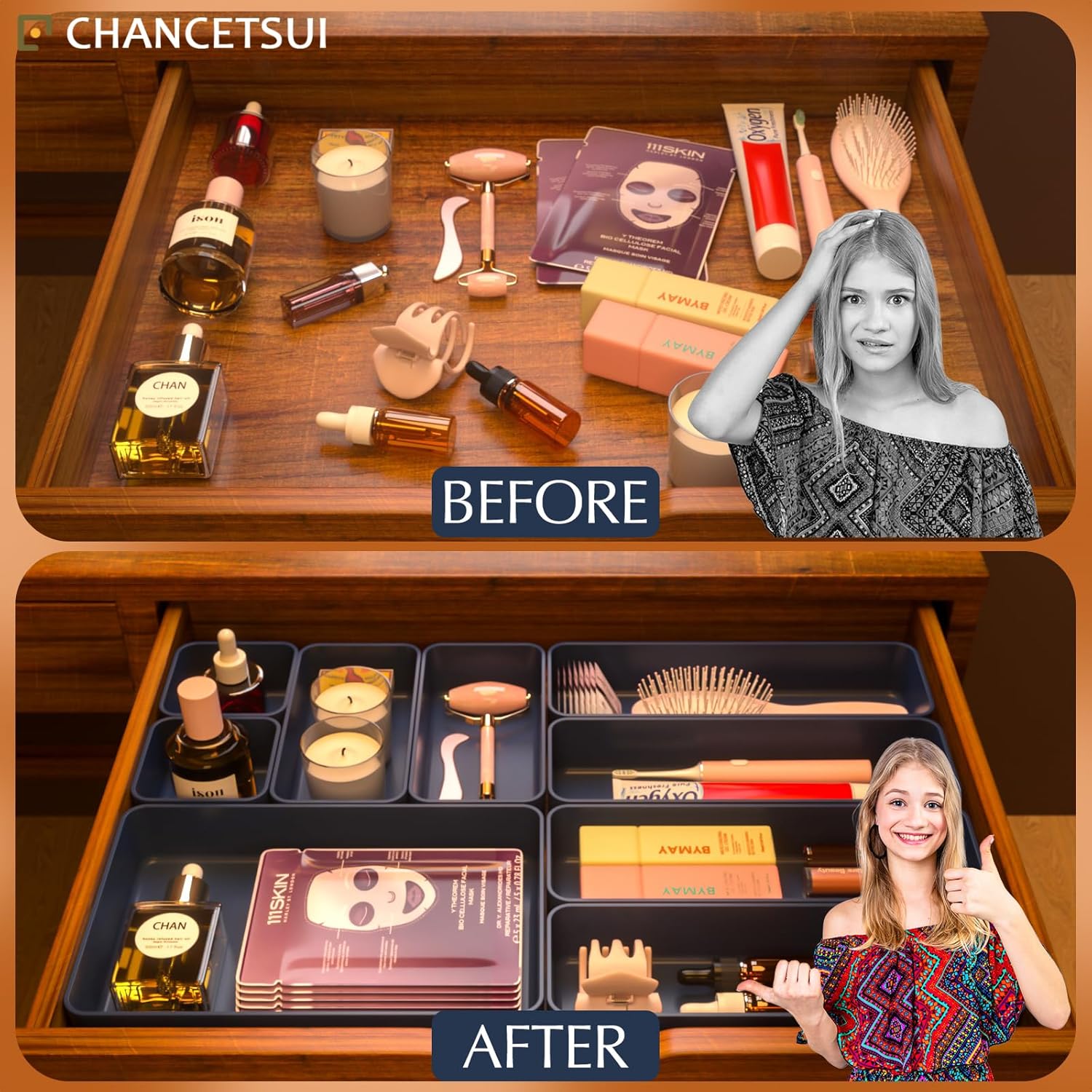 - 【Sturdy and Durable】The desk drawer organizer trays set are made of durable PET plastic, ensuring a long life of use. Drawer organizer bins are break-resistant and could accommodate different items keeping the organiser nice and steadily stacked.