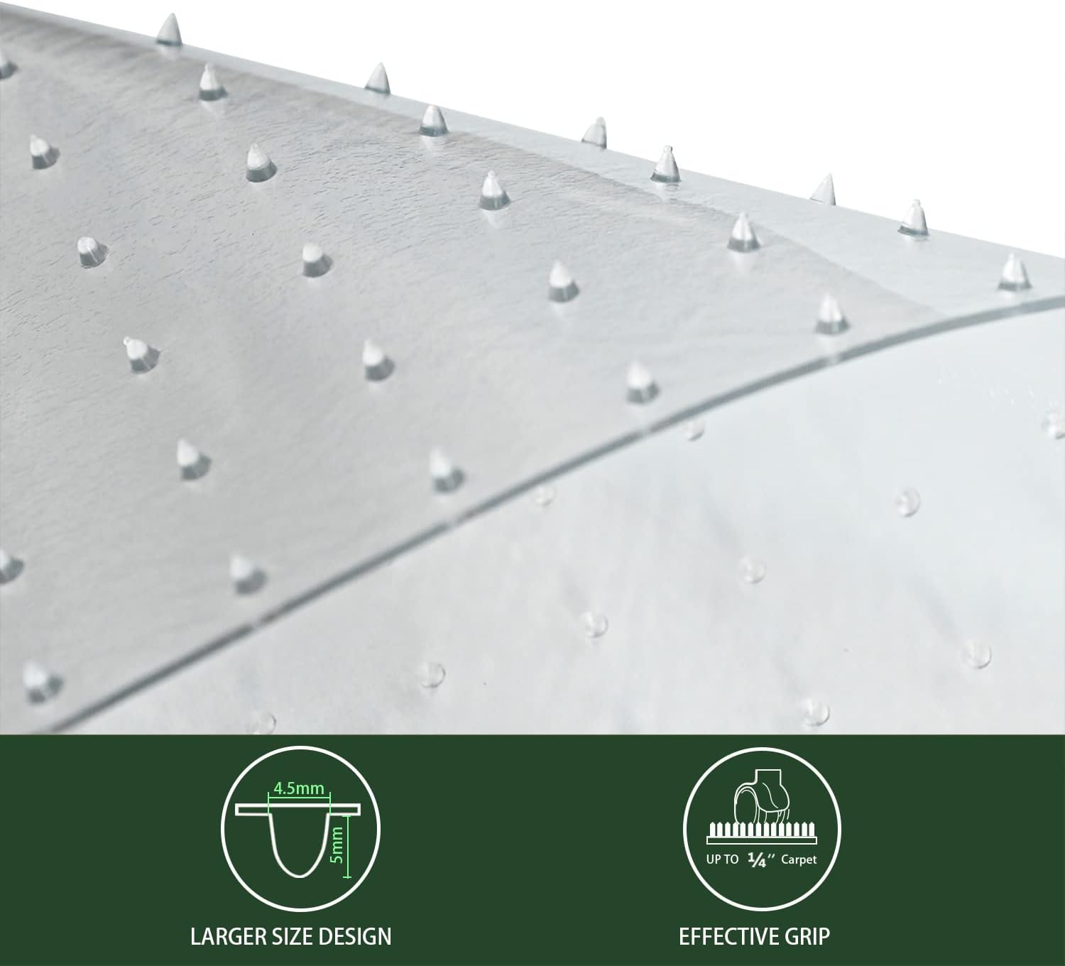 • UPGRADED MATERIAL: The clear office chair mat for carpet is made of upgraded material with a special grain on the front, that makes the chairs move more smoothly, The large nail on the back has a scientific structural design and density distribution, making the carpet chair mats more firmly fixed to the carpet.
