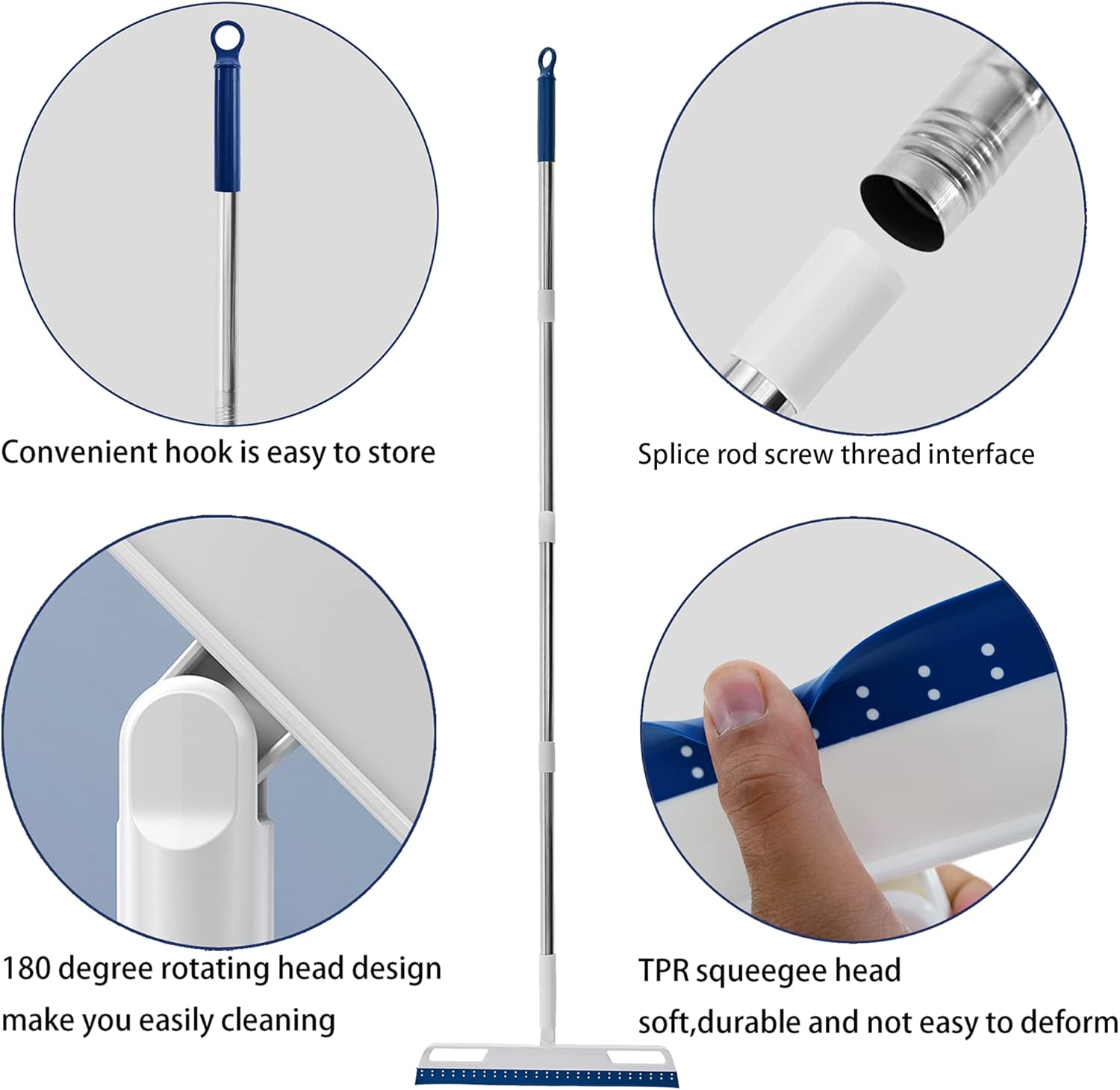 - Detachable Assembly Length: The detachable assembly length of the wiper mop is from about 56 inches for your convenience. With this feature, you can reach windows in high areas without using a step ladder and dust out underneath a couch. You can also use the short version in your bathroom to swipe out splashed water or hair strands. Scraping broom for use in kitchen, home, office or lobby.