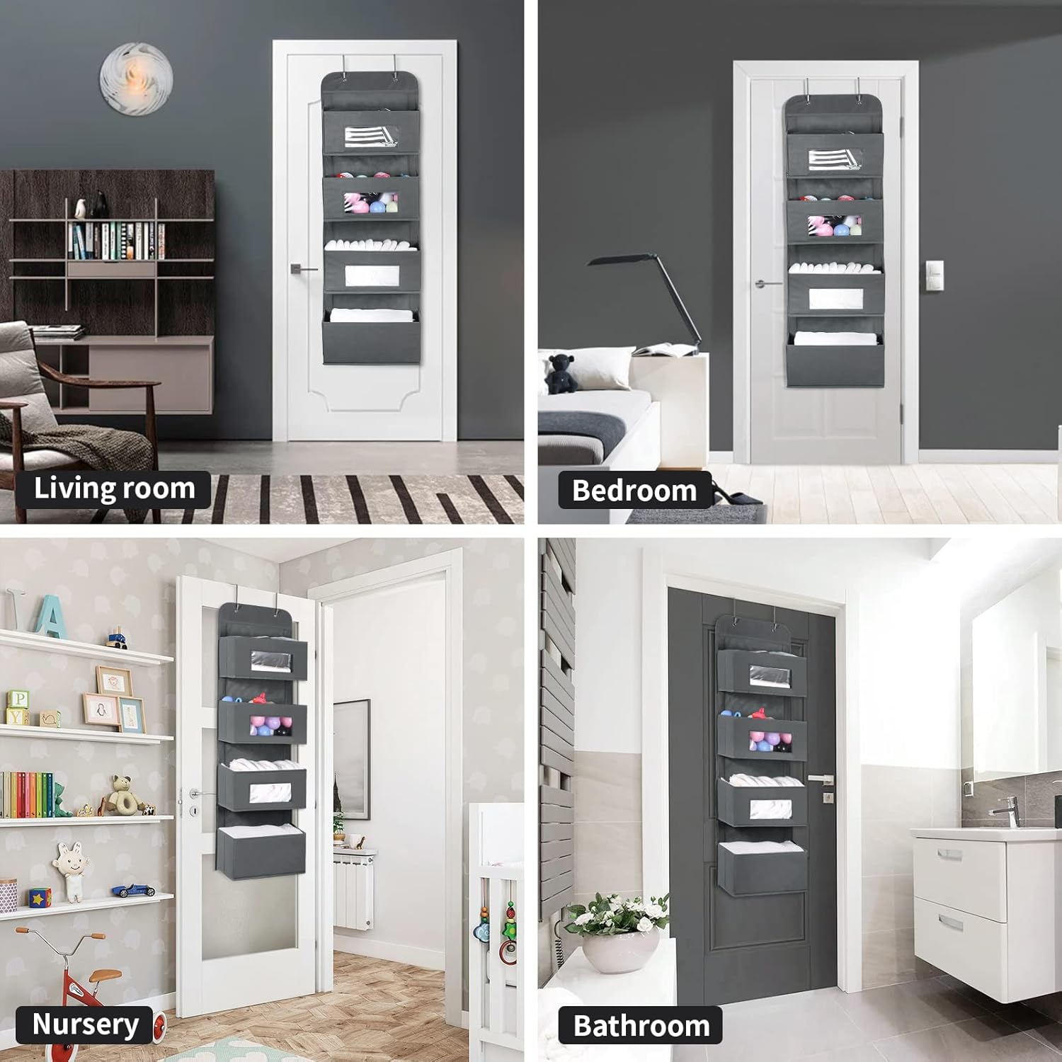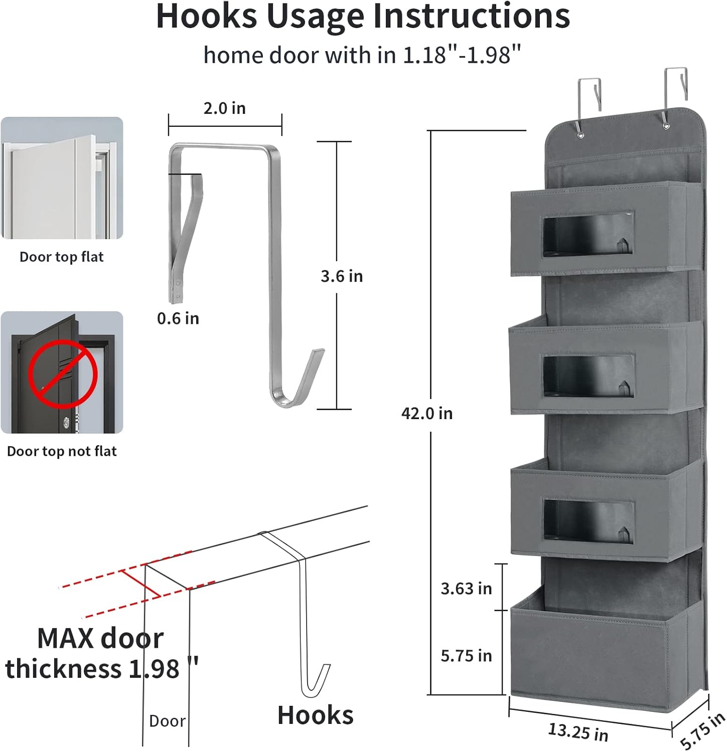 MAX Houser 4-Shelf Over The Door Hanging Organizer with 2 Metal Hooks,4 Pocket Over The Door Wall Mount Storage with Clear Windows for Baby Nursery Bathroom Closet,Bedroom,Dorm,Diapers,Kids Toys(Gray)