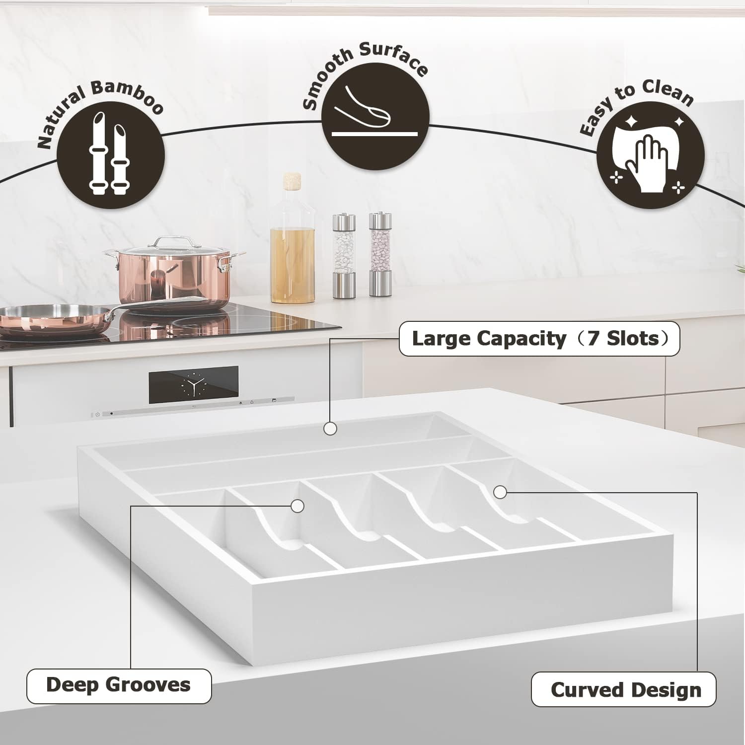 Utensil Organizer Silverware Drawer Organizer - 7 Slots Bamboo Cutlery Organizer Multi-Purpose Silverware Divider for Kitchen Flatware, Hair Accessories, Repair Tools, Art Set W13”x L17” (White)