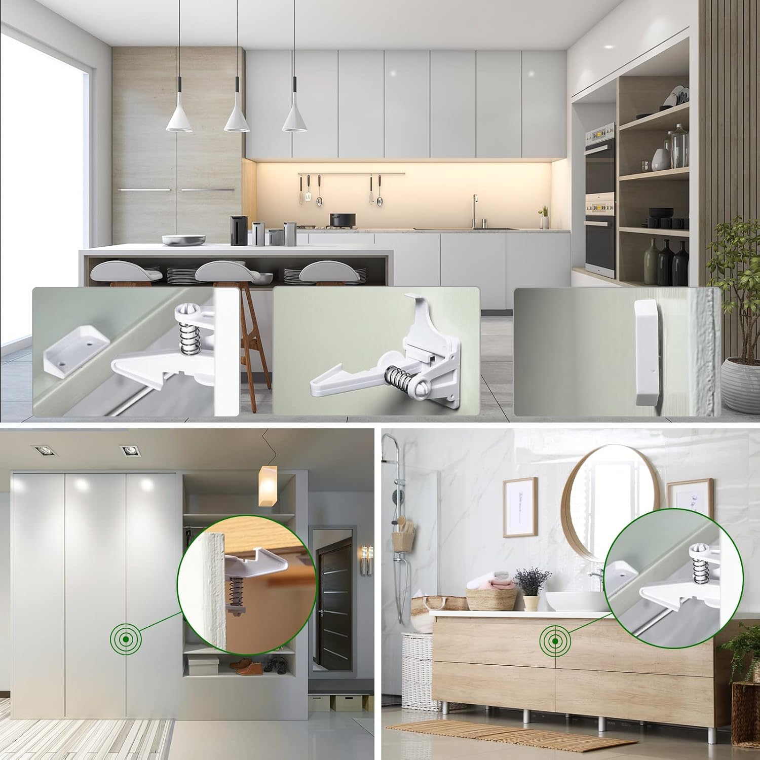 • Easy to Use: the cabinet latches provides protection and is easy to use, the hook fits well with the latch, and with a spring loaded design, parents and adults can easily open and lock with a single push of the spring loaded lock cabinets that don't require keys or magnets