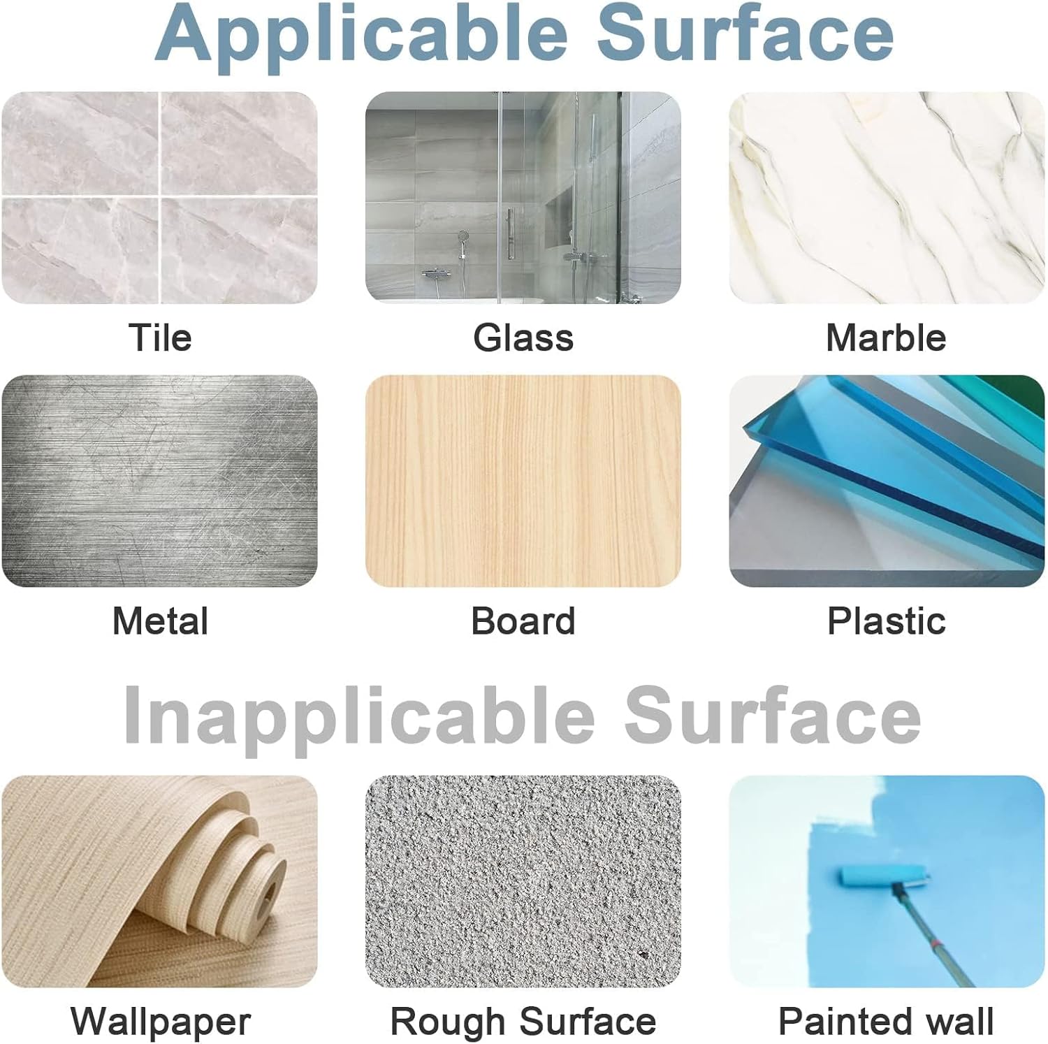 • Caution: The suction cup only works on Glass, Mirrors, Glossy porcelain tiles, Acrylic/Plastic shower snserts, Smooth stainless steel, Quartz, Laminate, and other smooth and non-porous surfaces. DO NOT install the suction over any porous, bumpy, rough, wooden, cracked or textured surface, such as painted walls, doors, wallpaper, unpolised marble, etc