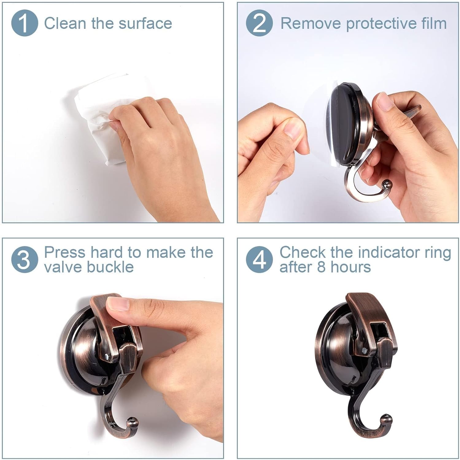 • Use Tips: If the hook can't be sucked up, please wash the surface of the rubber with water, then use a hair dryer to dry and soften the rubber before installation