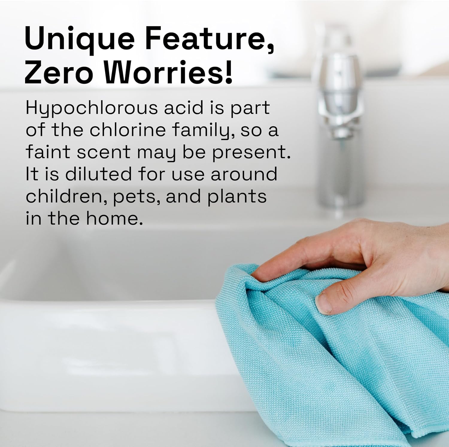 • Unique Feature: Hypochlorous acid is a part of the chlorine family, so there may be a faint scent. The hypochlorous acid is diluted for use around the home with children, pets, and plants