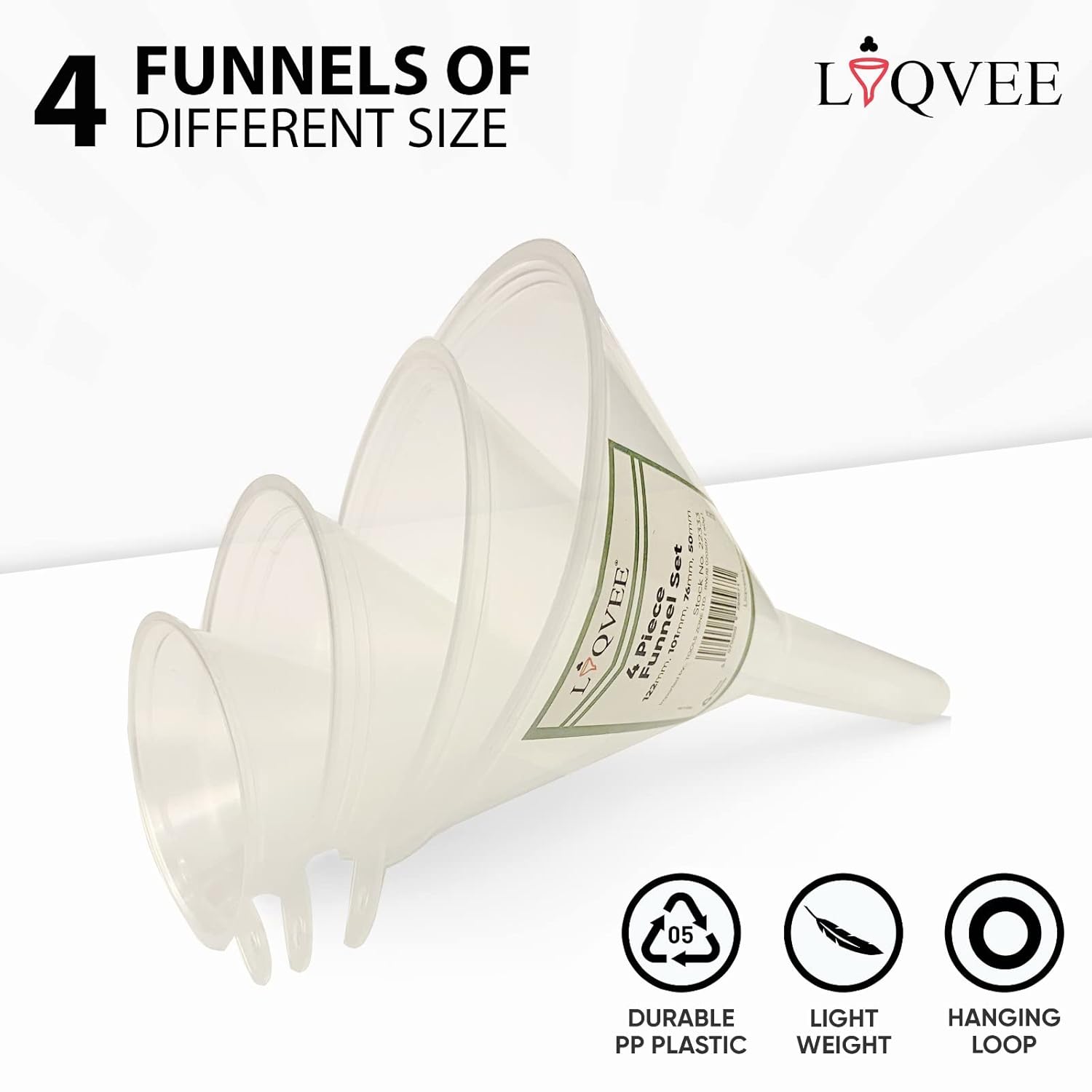 • 4 Funnels in One: Our plastic funnel set comes in a pack of different sizes to fit various applications. The extra-large funnel measures 120mm, the large one is 100mm, the medium 75mm, and the small funnel is 50mm. Each size has its specific function.