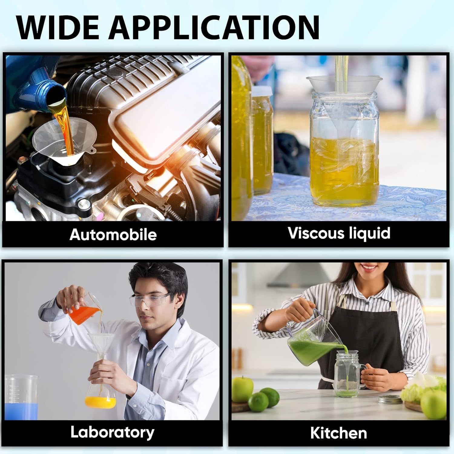 • Make Your Life Easier: Our funnel set is the perfect solution not only for transferring oil, spices, or car fuel but also for craft projects. Use the mini funnels for filling small bottles to sprinkle decorations on your art projects or for laboratory tasks at school.